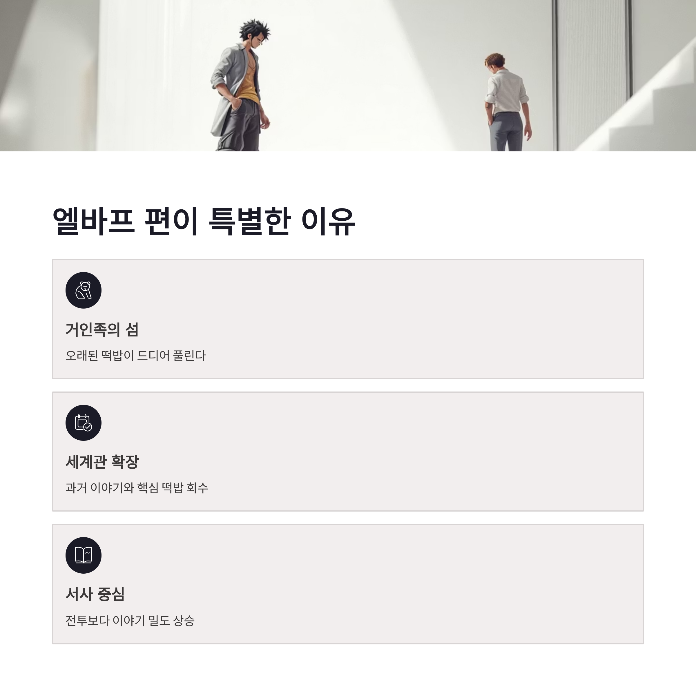 엘바프 편 장점은 명확해요. 세계관 핵심에 가까운 장소, 거인족 역사, 그리고 고대 무기 떡밥까지 연결 가능성! 원피스 1156화 애니 방영일 이후 이게 한꺼번에 풀릴 수 있다는 점이 제일 큽니다. 반면 단점도 있어요. 전개가 느리게 느껴질 수 있다는 점… 몰아보는 분들은 살짝 답답할 수도 있겠더라구요. 그래도 이건 장기적으로 보면 필요한 구간 같아요. 솔직히 원피스는 이런 구간 지나야 레전드 터지잖아요 ㅋㅋ