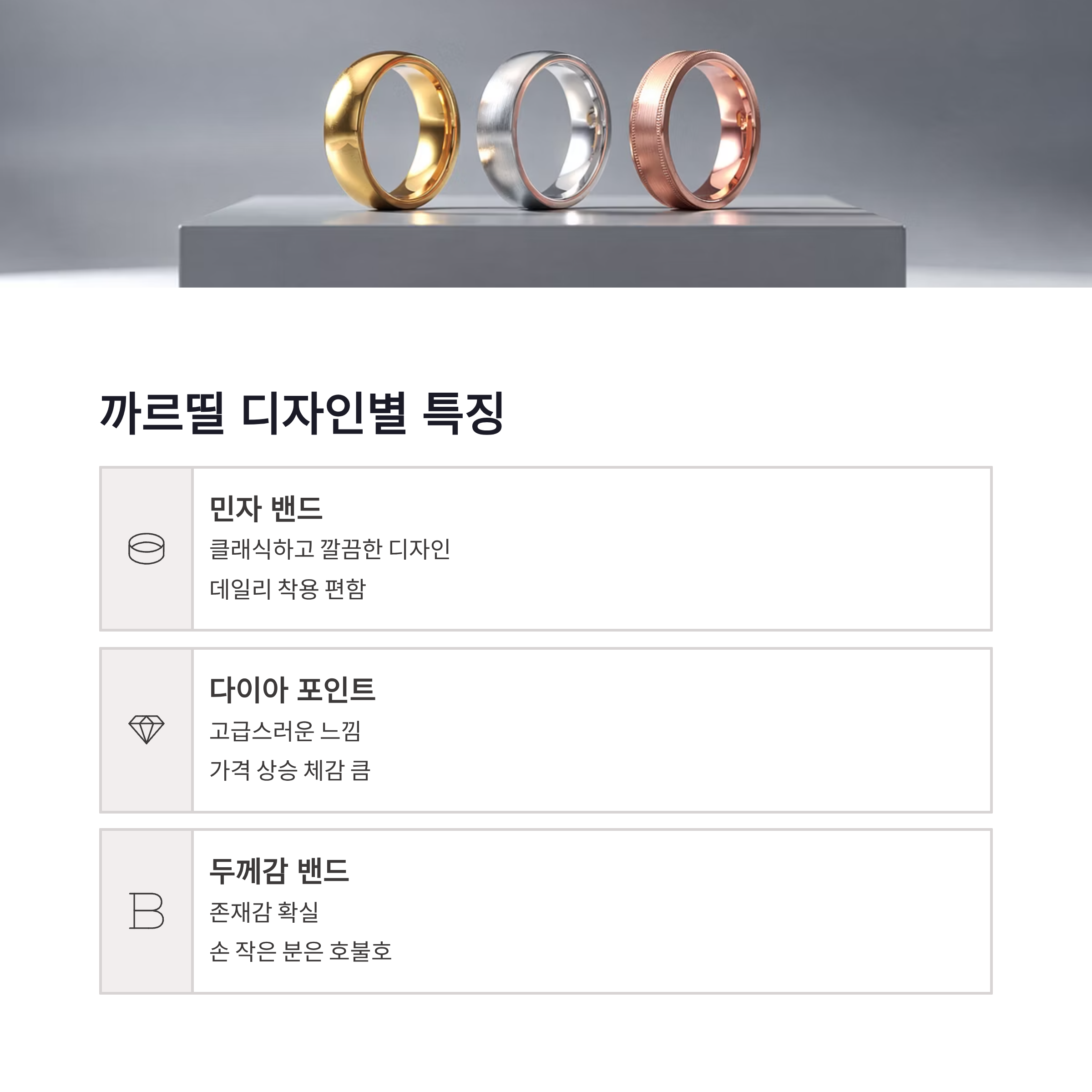 까르띠에 말고도 다른 브랜드들도 같이 봤는데, 확실히 성향이 갈리더라구요. 디자인에 힘 준 곳, 가격 접근성 좋은 곳, 커스터마이징 강한 곳 등등. 웨딩밴드 고를 때 제가 느낀 장단점은 이랬어요. 장점은 브랜드 스토리와 안정감, 단점은 가격 부담… 이건 거의 공통이더라구요. 대신 오래 써도 질리지 않는 디자인이라는 건 인정. 반대로 가격대 낮은 브랜드는 트렌디하지만 몇 년 지나면 취향 바뀔 수도 있겠다 싶었구요. 결국 웨딩밴드는 유행보다 생활에 맞는 게 제일 중요한 것 같더라구요.
