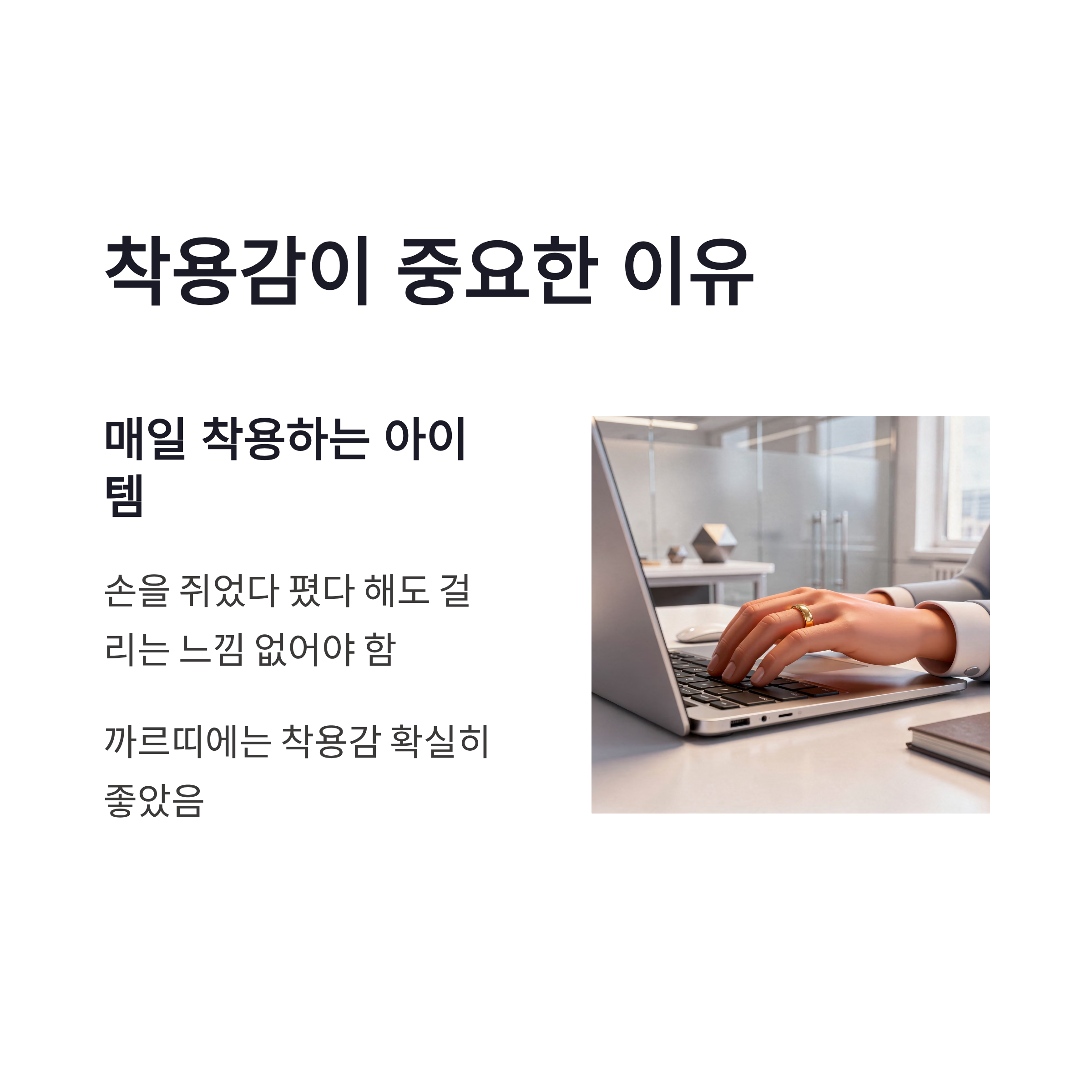 착용감은 확실히 좋았어요. 웨딩밴드를 매일 낄 거라면 이 부분은 진짜 무시 못 하겠더라구요. 손을 쥐었다 폈다 해봐도 걸리는 느낌 거의 없었구요.