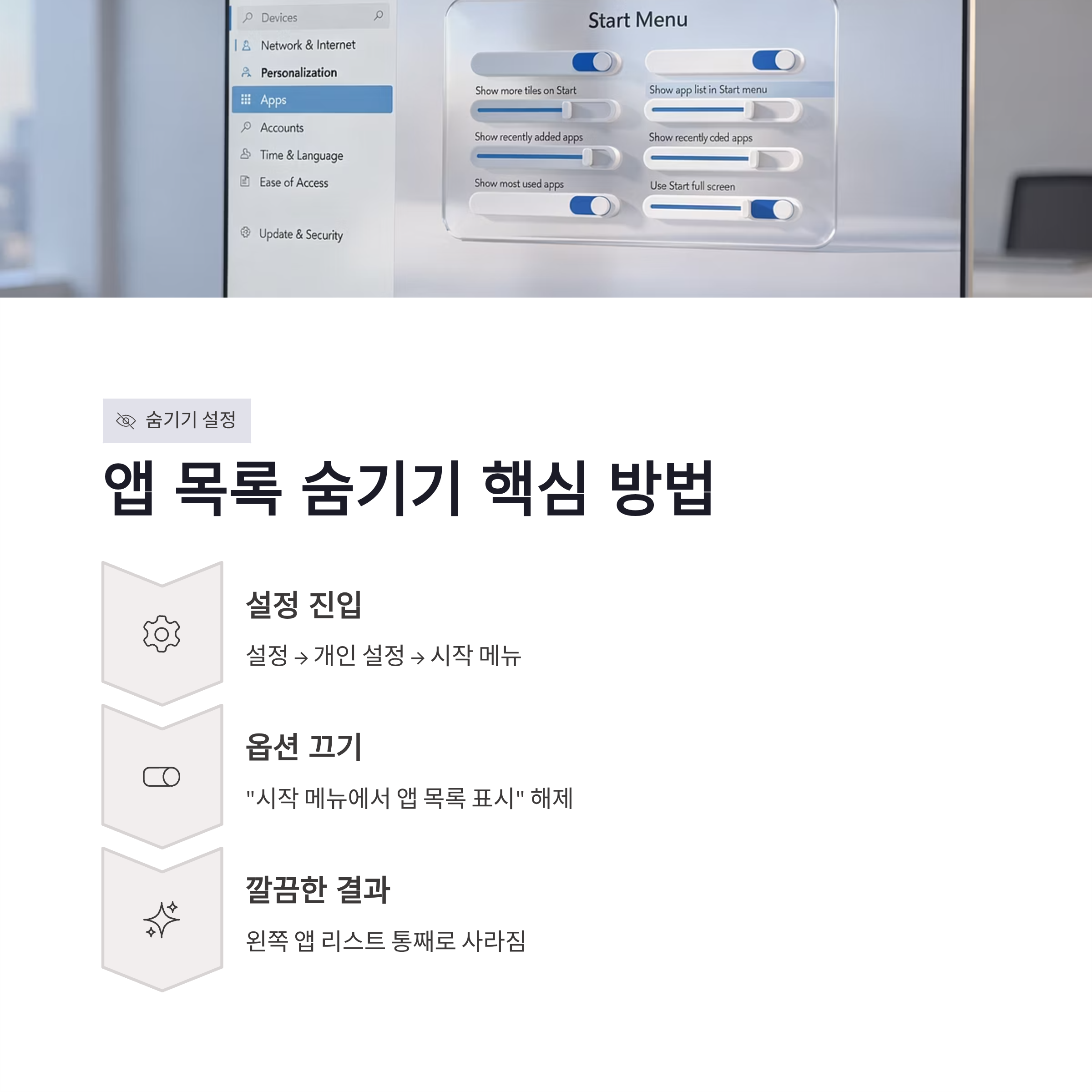 | 앱 목록 표시 끄기 | 전체 앱 숨김 | 시작 메뉴 깔끔함 ↑ |