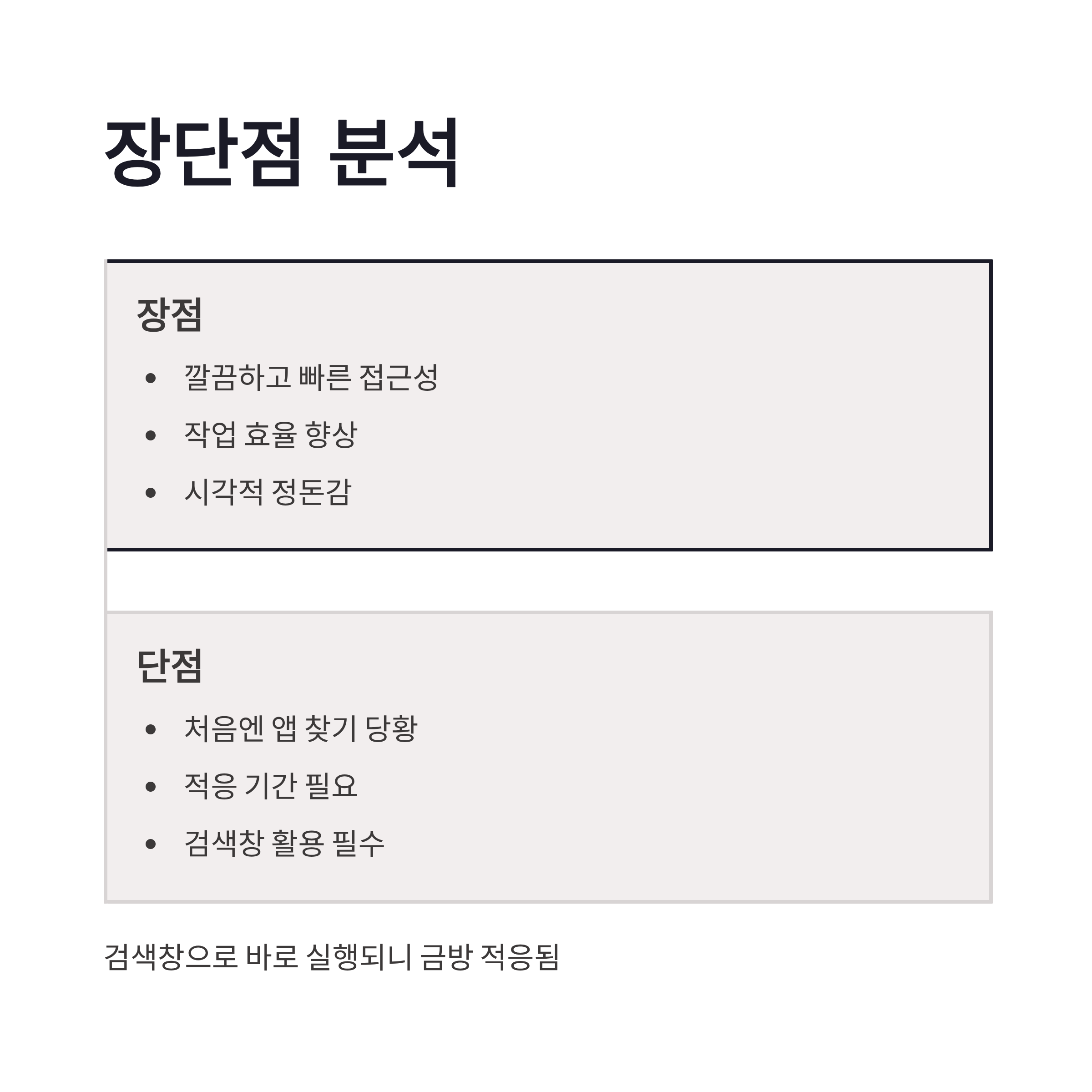 | 타일 고정 | 자주 쓰는 앱 바로 실행 | 작업 속도 ↑ |