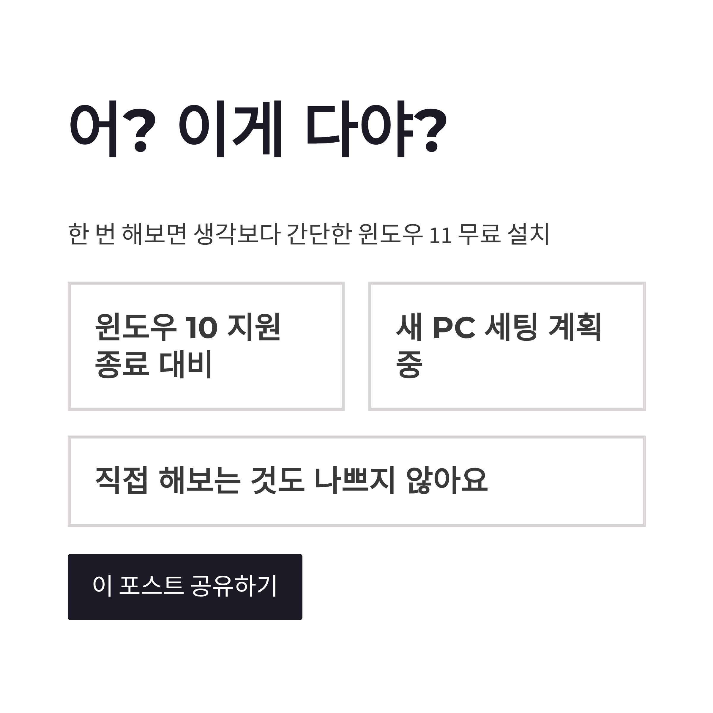 막연히 어렵게 느껴졌던 게, 정보가 흩어져 있어서 그랬던 것 같구요. 한 번 해보면 “어? 이게 다야?” 싶은 느낌 들더라구요 ㅎㅎ 컴퓨터 새로 세팅할 계획 있거나, 윈도우 10 지원 종료 앞두고 고민 중이라면 윈도우 11 무료 설치 한 번쯤은 직접 해보는 것도 나쁘지 않겠쥬?