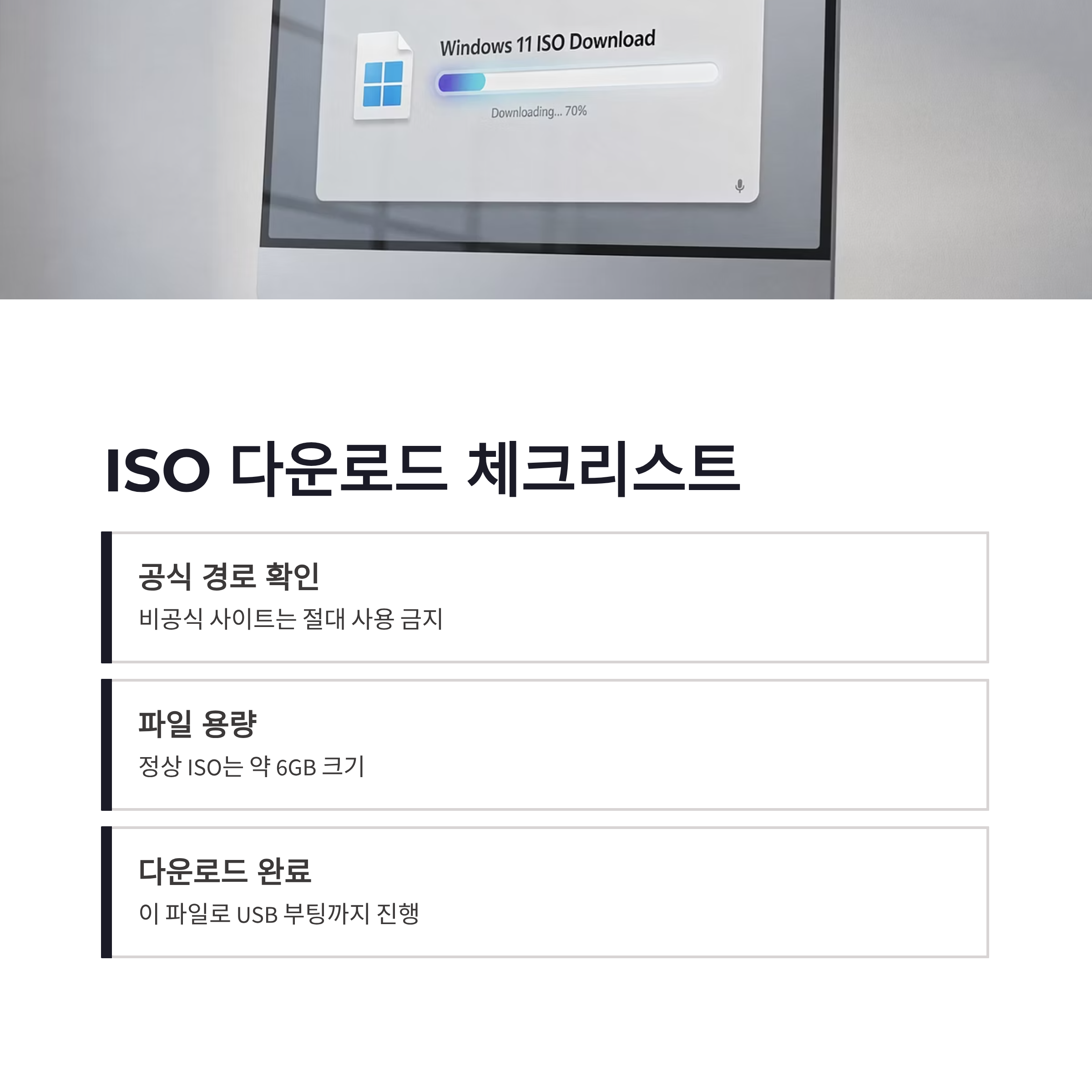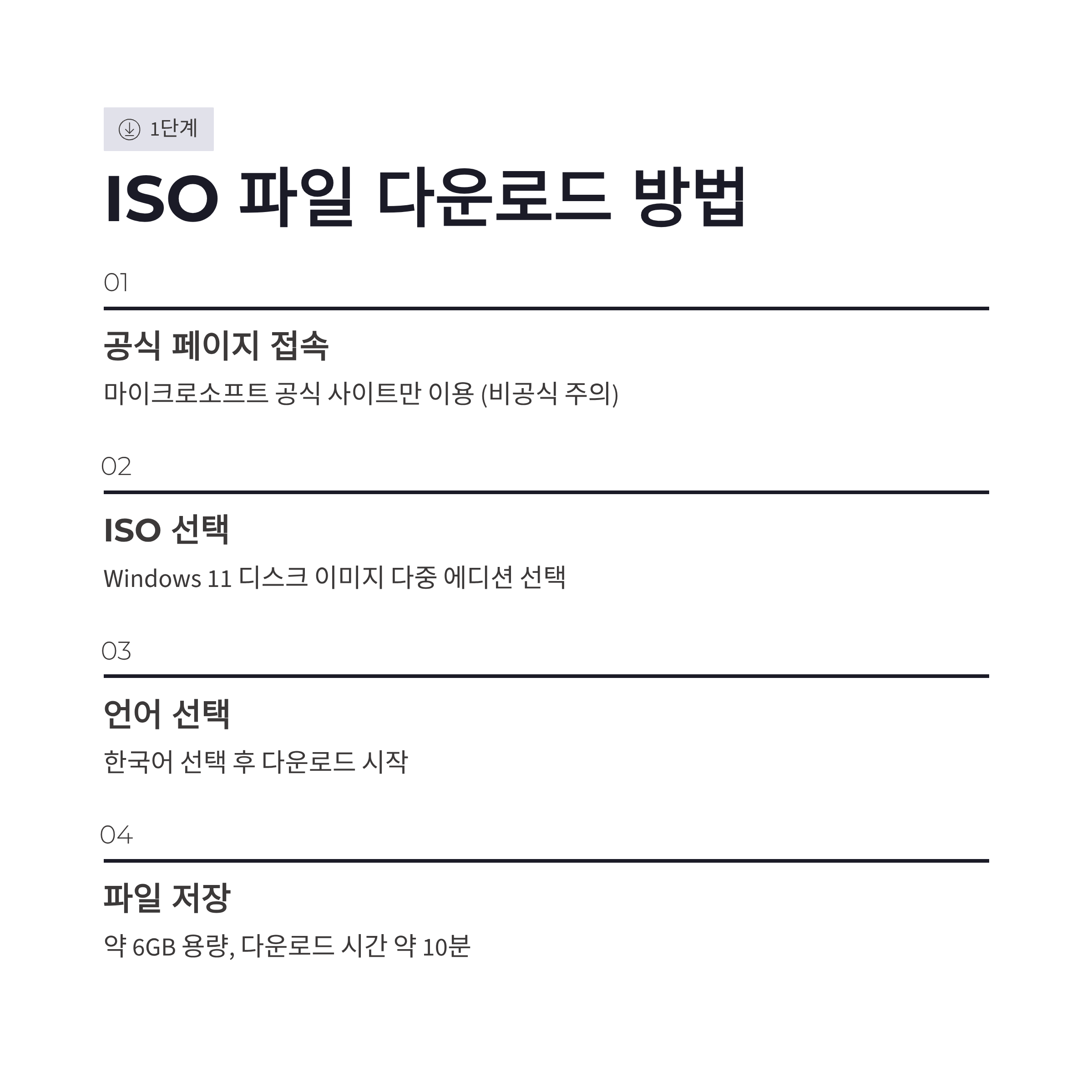 | 단계 | 내용 | 체크 포인트 | | -- | -------------------------- | ---------- | | 1 | 마이크로소프트 공식 페이지 접속 | 비공식 사이트 주의 | | 2 | Windows 11 디스크 이미지(ISO) 선택 | 다중 에디션 ISO | | 3 | 언어 선택 후 다운로드 | 한국어 선택 | | 4 | ISO 파일 저장 | 용량 약 6GB |