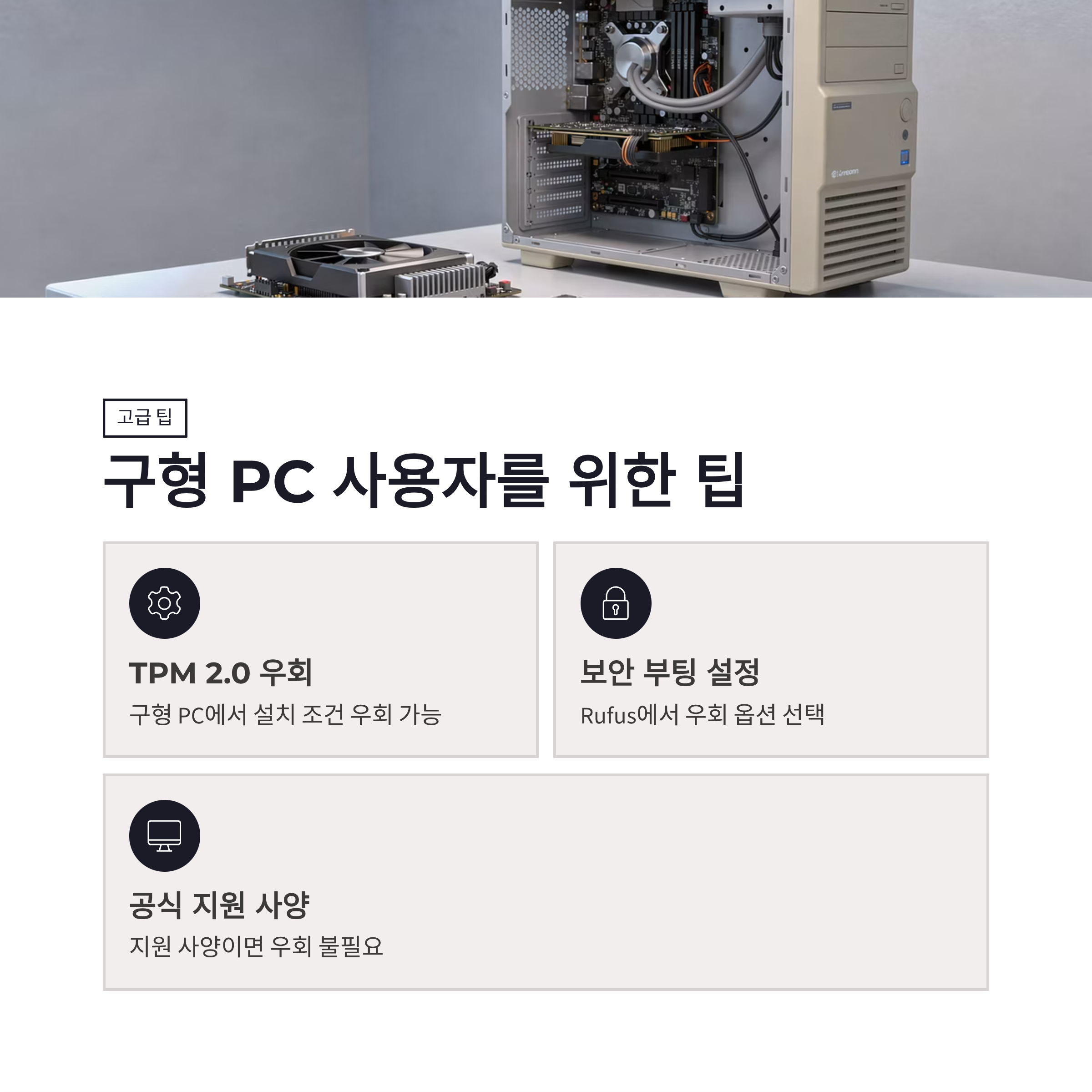 장점부터 말하면, 클릭 몇 번이면 끝난다는 거. 단점은 USB 안에 있던 파일이 전부 날아간다는 점… 이거 모르고 했다가 살짝 멘붕 왔네요 ㅋㅋ 요즘 트렌드는 TPM 2.0, 보안 부팅 조건 우회 옵션까지 같이 설정하는 경우도 많아졌는데, 구형 PC 쓰시는 분들에겐 이게 은근히 핵심이더라구요. 다만, 공식 지원 사양이면 굳이 우회 안 해도 깔끔하게 설치됩니다.