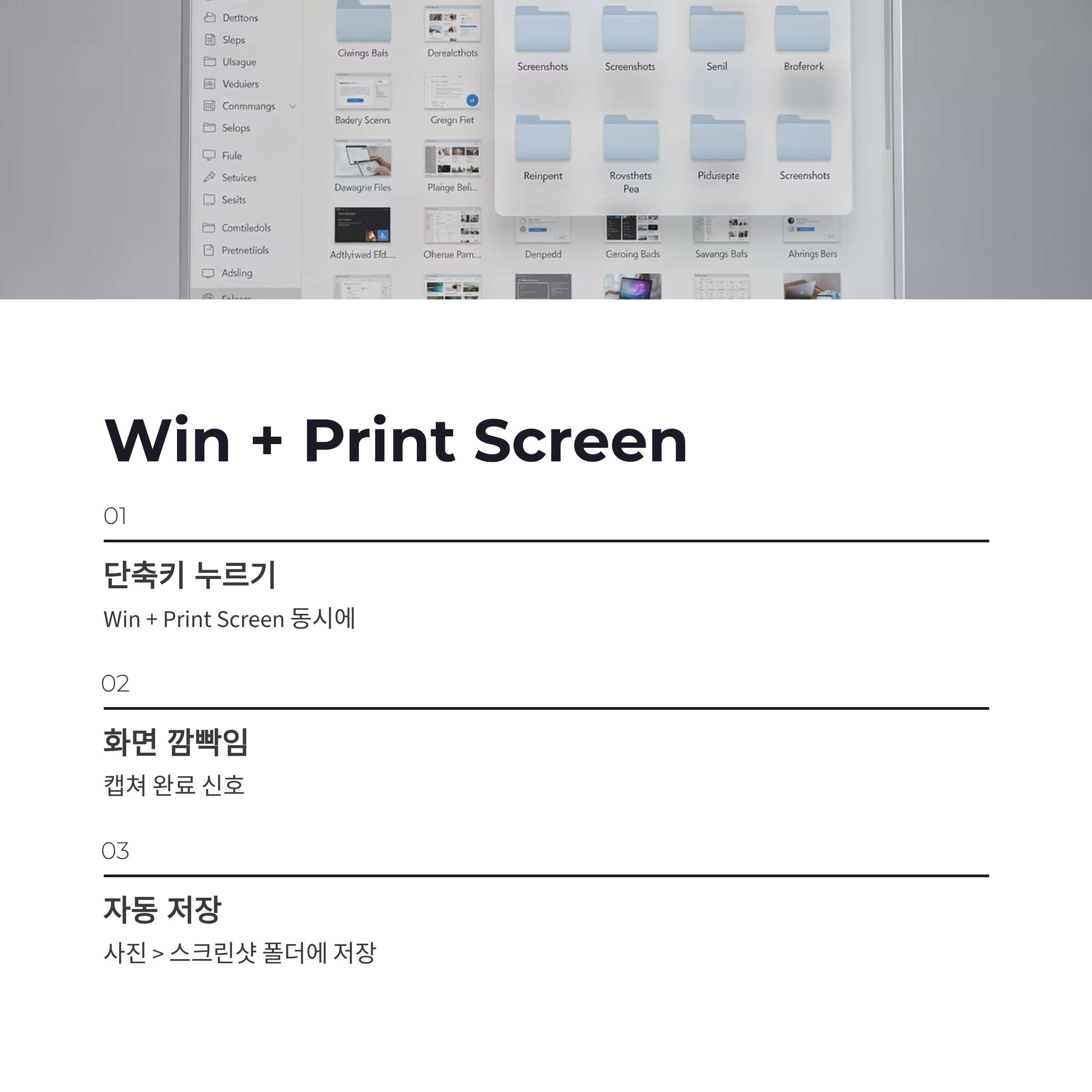 | Win + Print Screen | 전체 화면 | 사진 > 스크린샷 |