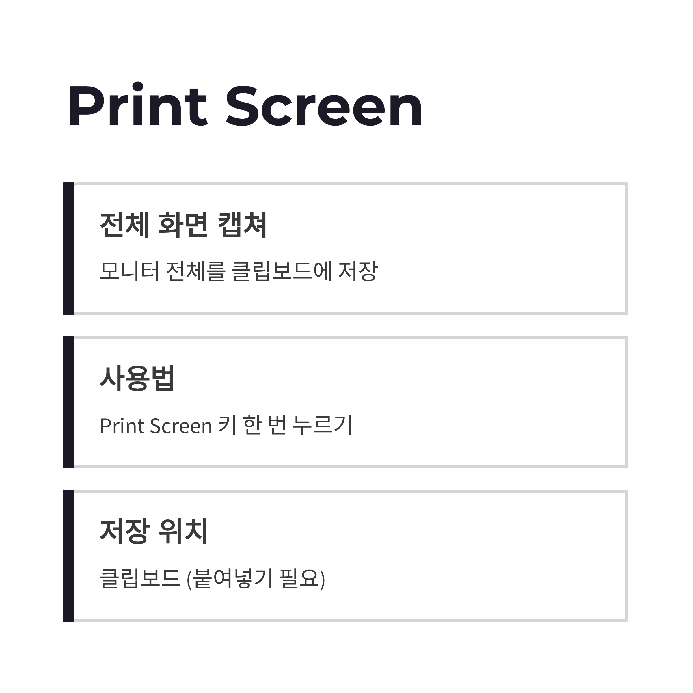 | Win + Print Screen | 전체 화면 | 사진 > 스크린샷 |