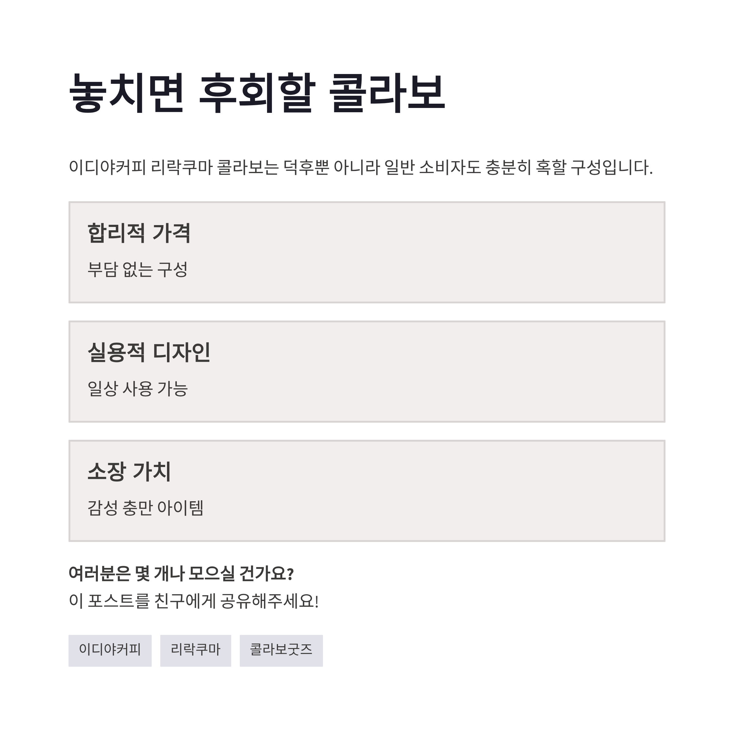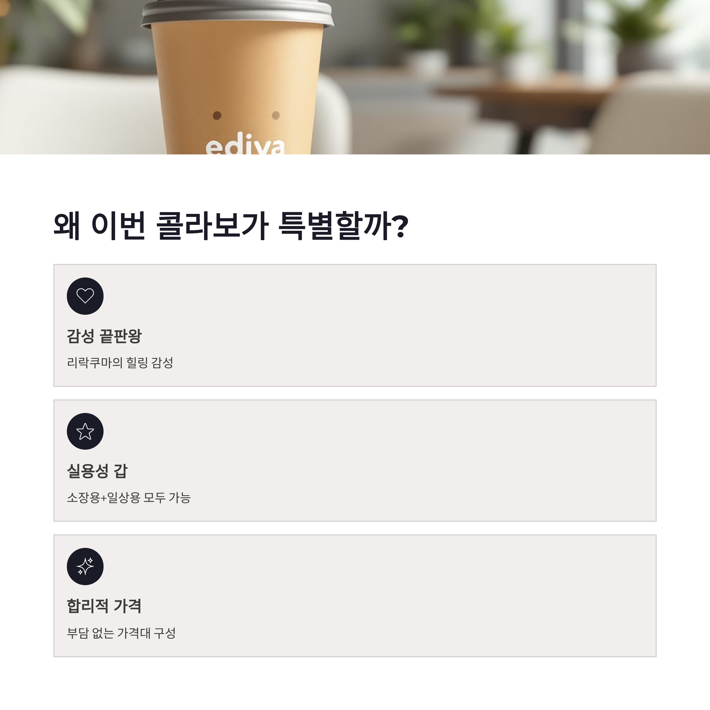 요즘 카페 콜라보 굿즈 많잖아요. 근데 이디야커피 리락쿠마 콜라보는 확실히 실용성+전시용 사이를 잘 잡았어요. 마그넷은 냉장고에 붙여도 귀엽고, 컵은 데일리로 써도 튀지 않구요. 장점은 디자인 통일감이 좋다는 거! 단점이라면… 랜덤 시스템 때문에 원하는 캐릭터 뽑기 어려운 점? ㅠㅠ 그래도 리락쿠마 감성은 여전히 강력해서, 결국 손이 가게 됩니다.
