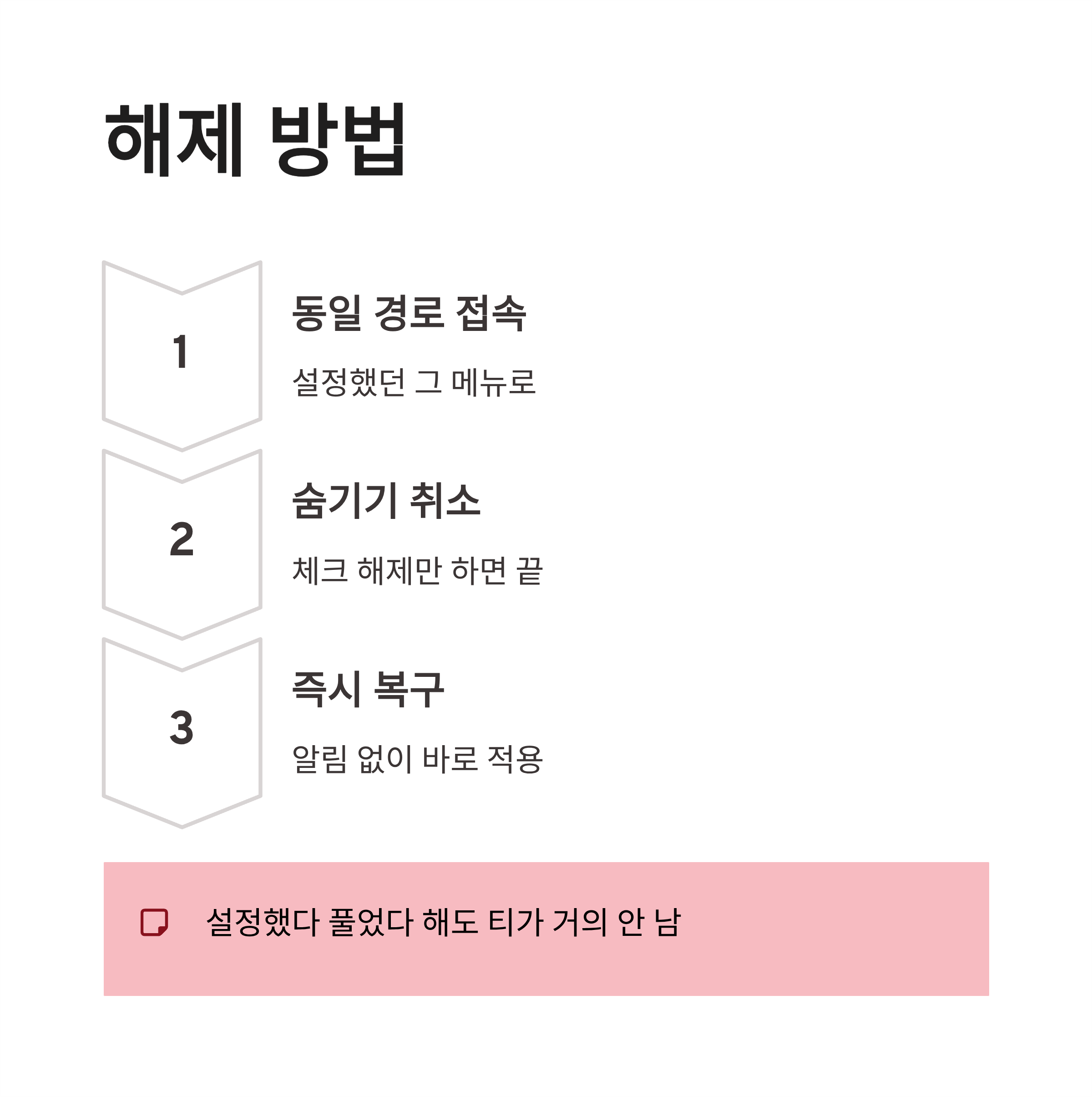 | 해제 방법 | 동일 경로에서 숨기기 취소 | 즉시 복구됨 |