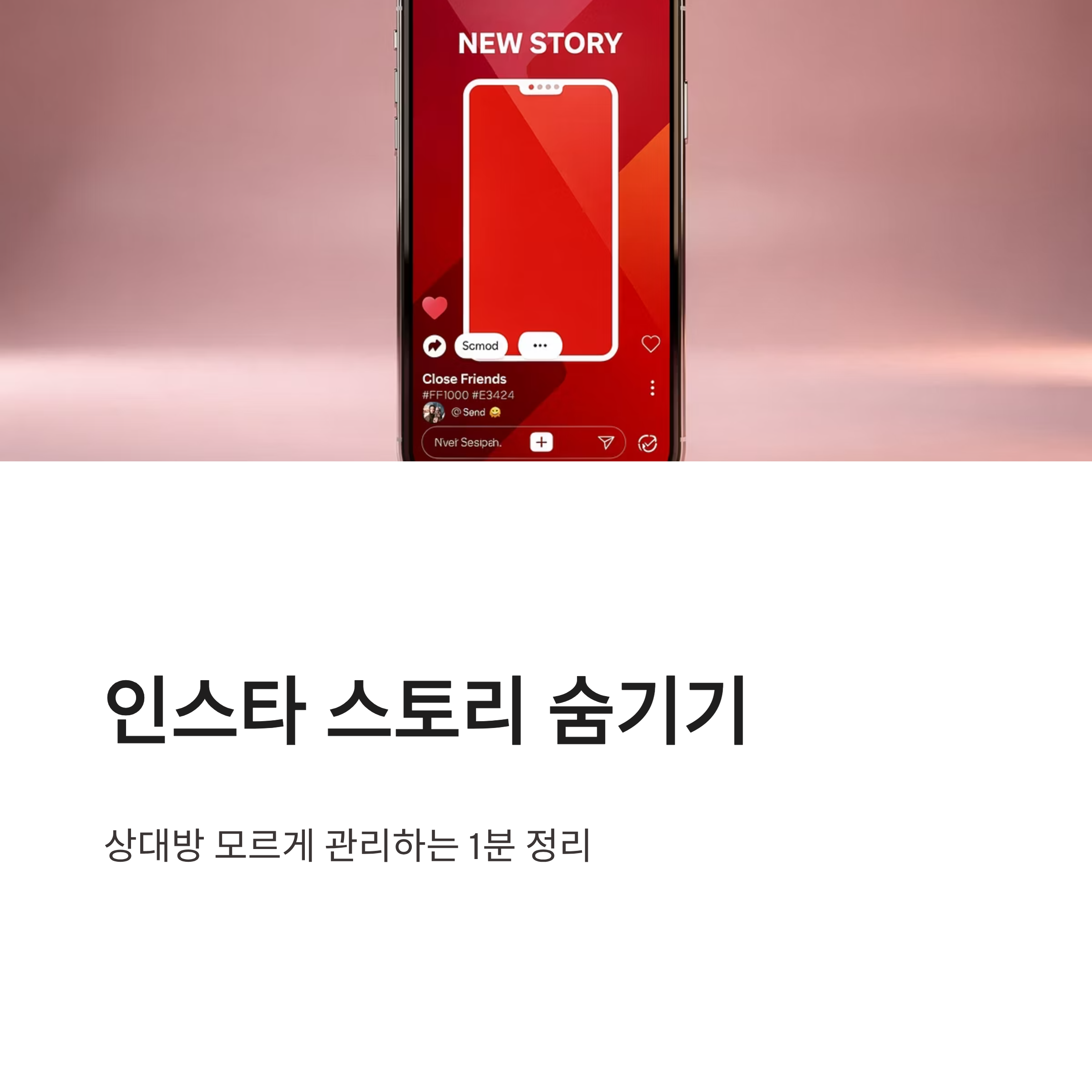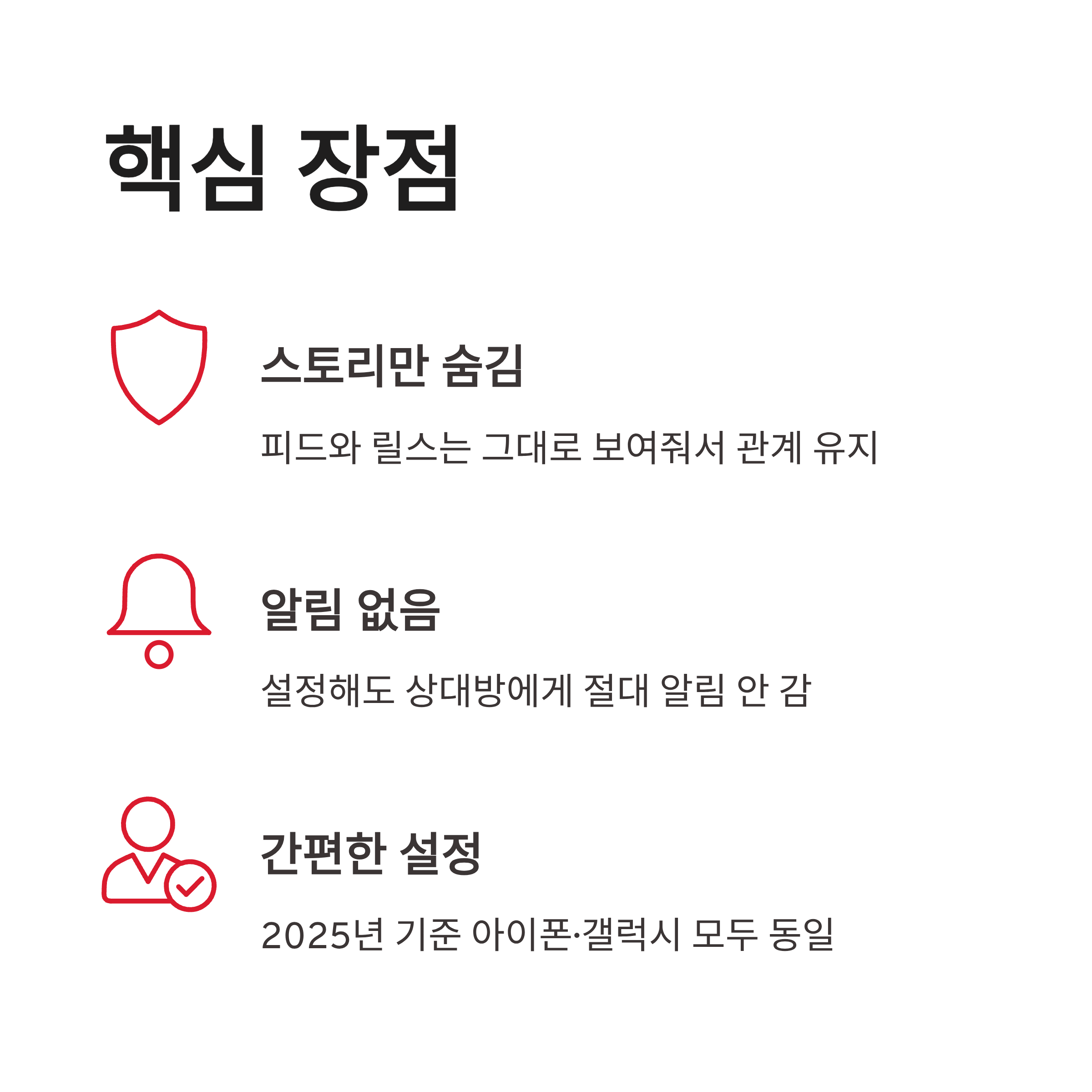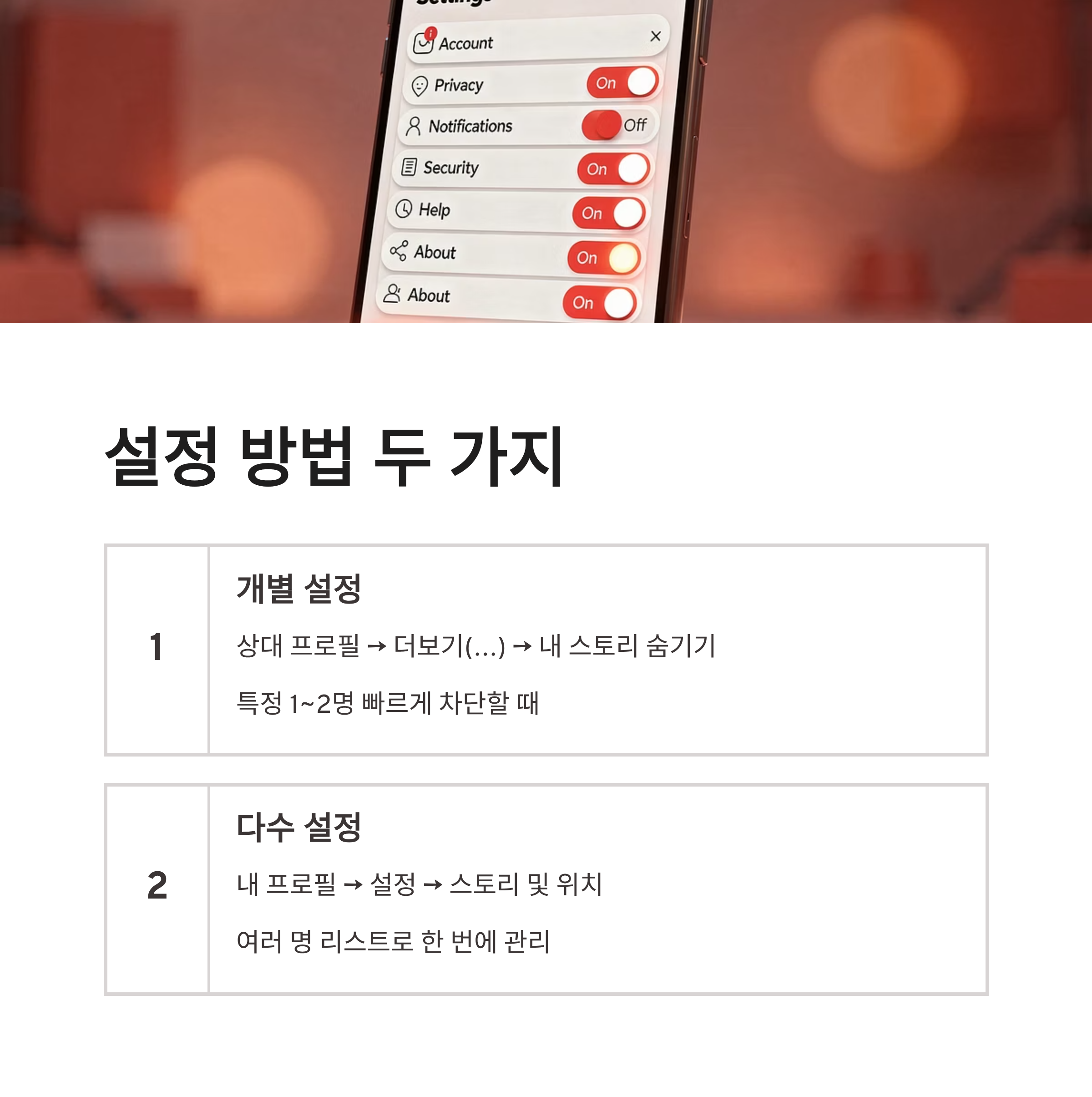 | 개별 설정 | 상대 프로필 → 더보기(…) → 내 스토리 숨기기 | 특정 1~2명 빠르게 차단 |