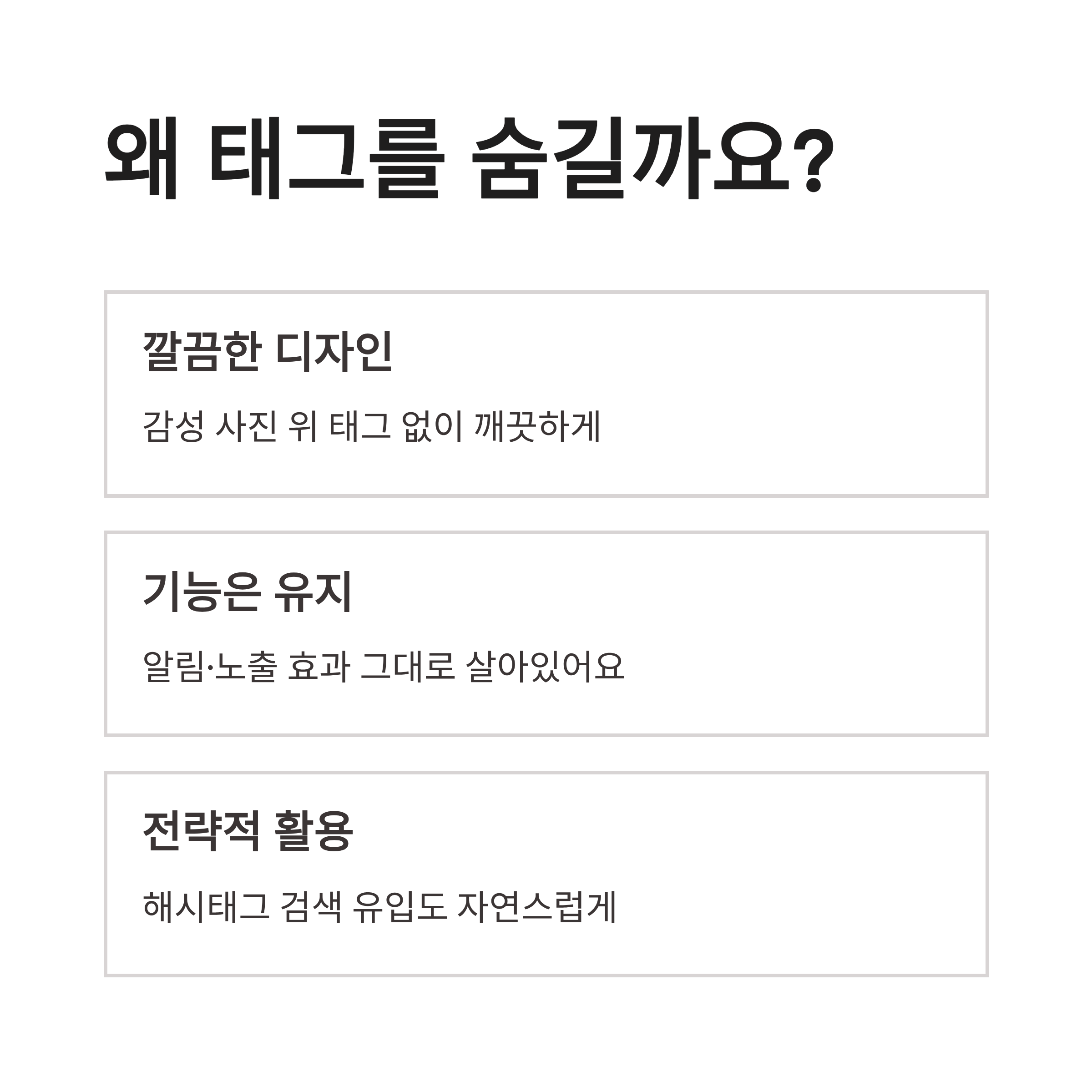 정리해보면 인스타 스토리 태그 숨기기는 감성·노출 둘 다 챙기는 기술이에요. 디자인 깔끔 + 알림 정상 + 해시태그 노출 유지, 이 조합이면 안 쓸 이유가 없더라구요. 한 번 익숙해지면 스토리 올릴 때 자동으로 손이 가요 ㅎㅎ 여러분은 스토리 올릴 때 깔끔함이 더 중요하신가요, 아니면 노출이 더 중요하신가요?