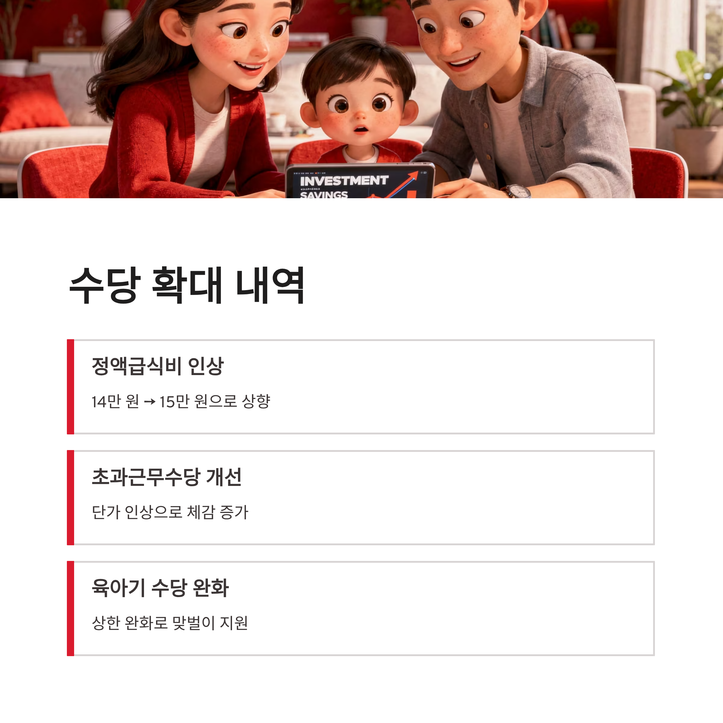 특히 정액급식비, 초과근무수당 같이 모든 직군 공통 수당이 같이 올라가서 체감이 커요. 연관해서 많이들 찾는 게 육아기 수당인데, 이 부분도 상한이 완화돼서 맞벌이 공무원들한테는 꽤 도움 될 듯했어요.