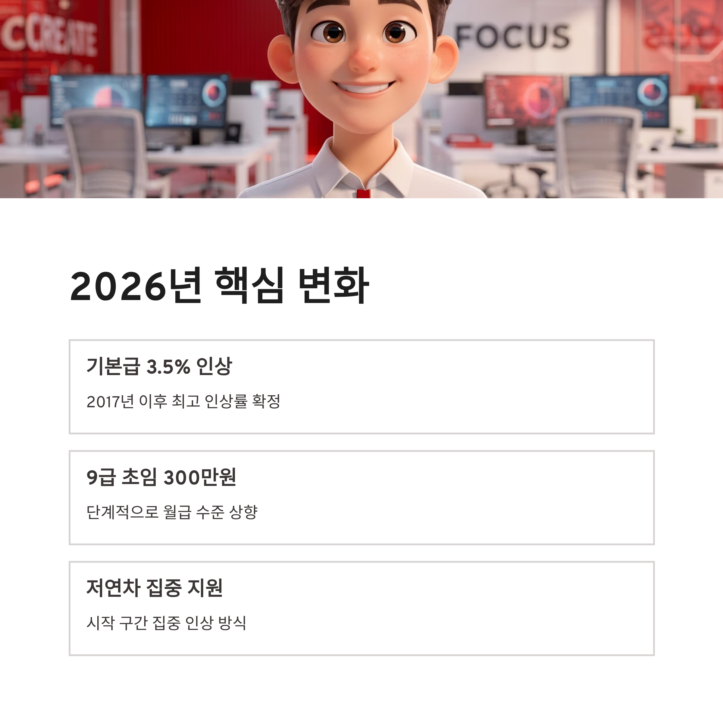 2026년 공무원 보수 체계 개편 소식 들었을 때 솔직히 저도 “이번엔 말만 아니겠지?” 싶었는데요. 뚜껑 열어보니 꽤 현실적인 변화더라구요. 2026년 공무원 보수 체계는 저연차, 특히 9급 초임 중심으로 구조를 손본 게 포인트예요. 기본급 3.5% 인상 확정, 이거 숫자만 보면 작아 보일 수 있는데 2017년 이후 최고치라 의미가 큽니다. 9급 초임 월급을 단계적으로 300만 원 수준까지 끌어올리겠다는 방향성도 공식화됐구요. 그냥 전체 평균 올리는 방식이 아니라, 시작 구간을 집중적으로 밀어준 느낌이라 체감이 다를 것 같더라구요. 이제 진짜 초임 공무원도 숨 좀 쉬겠구나 싶었달까요.