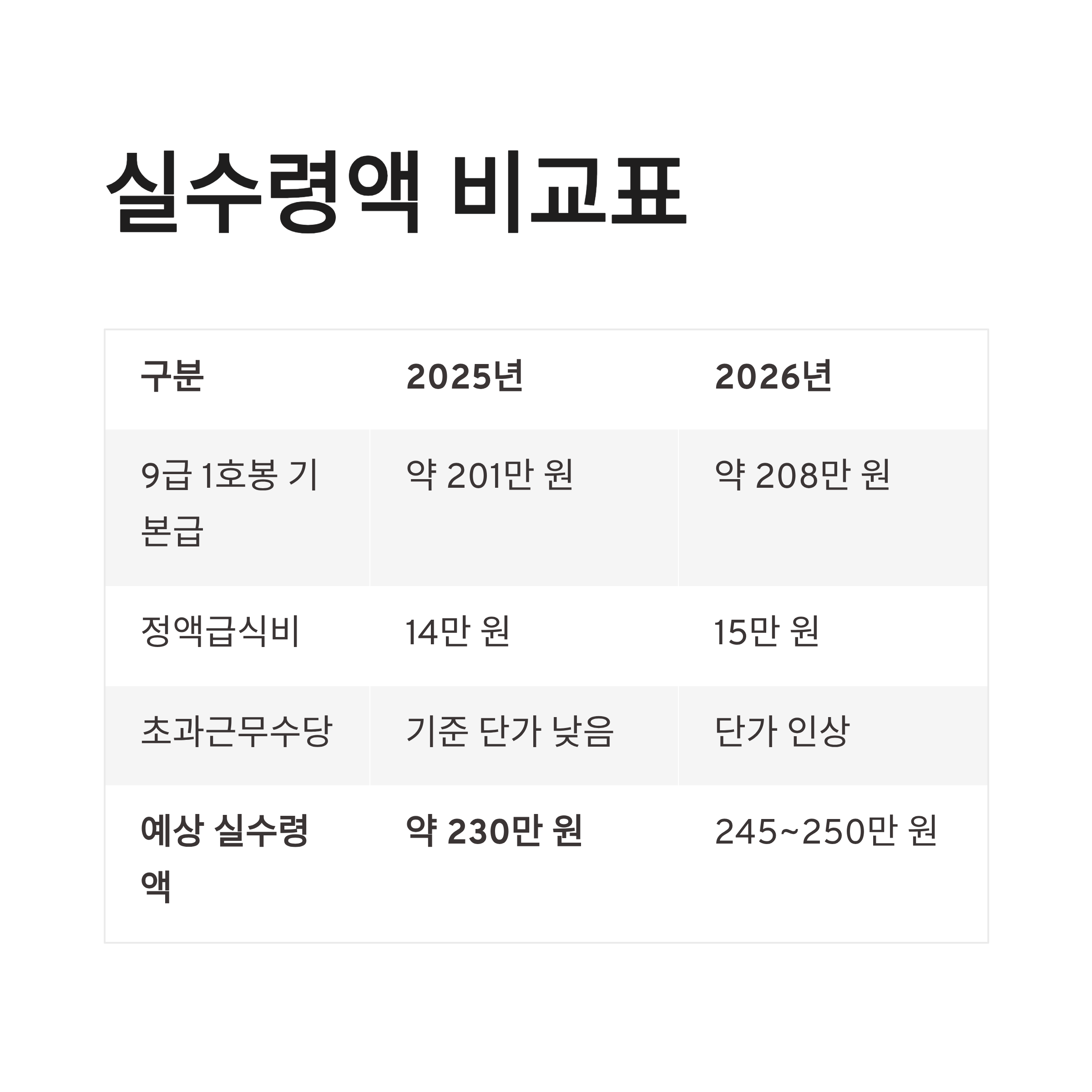 | 예상 실수령액 | 약 230만 원 | 245~250만 원 |