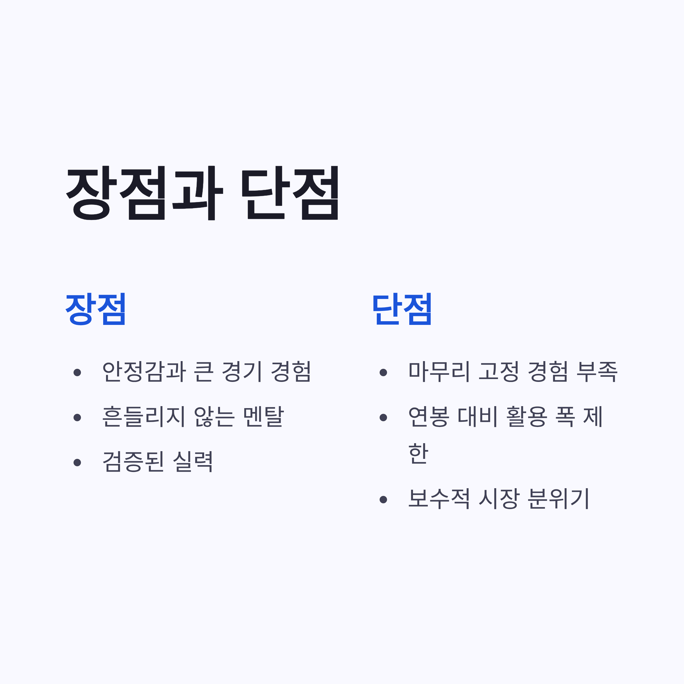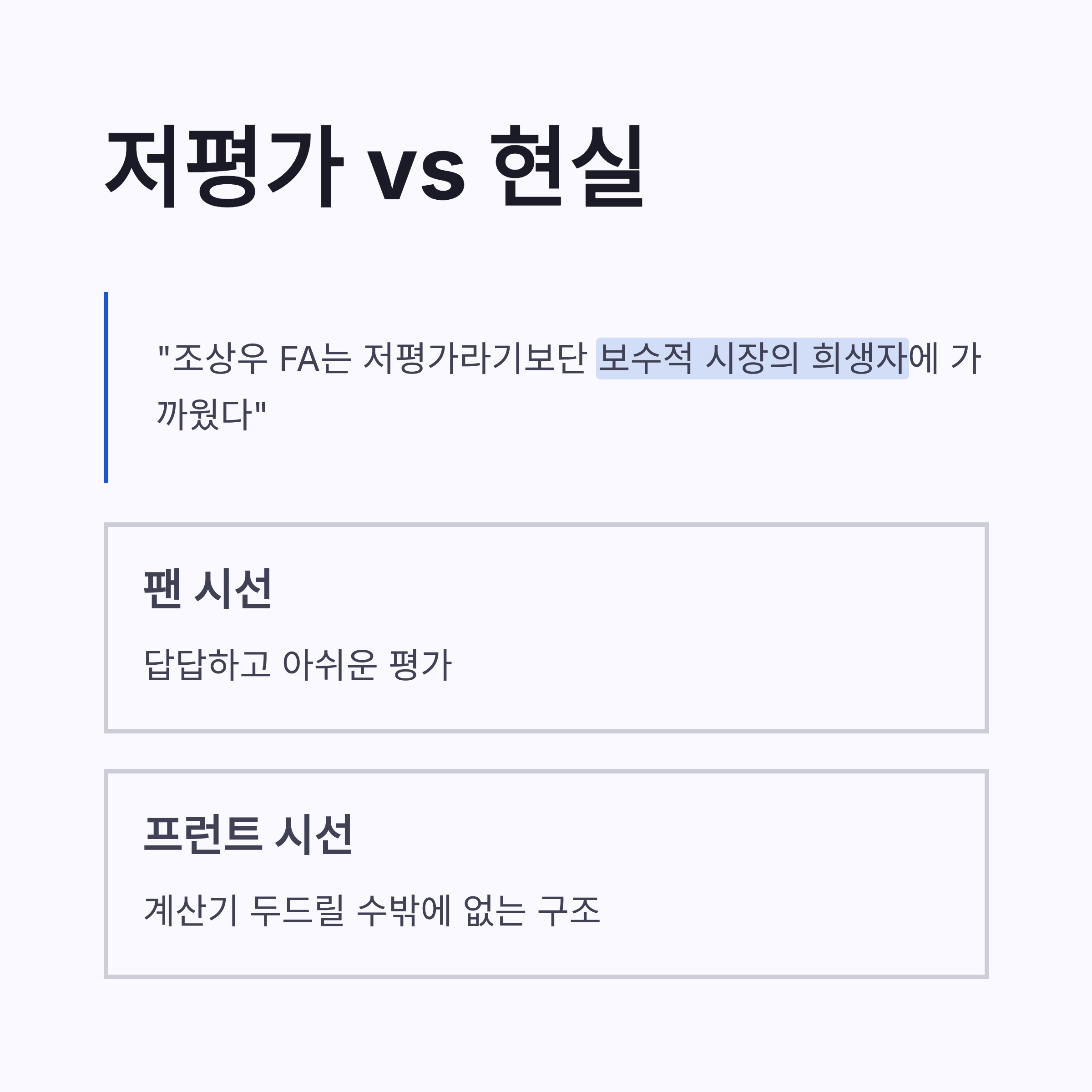 2025 시즌을 돌아보면 조상우 FA가 가진 장점은 분명합니다. 안정감, 큰 경기 경험, 흔들리지 않는 멘탈. 근데 단점도 또렷했어요. 마무리 고정 경험 부족, 연봉 대비 활용 폭 제한, 그리고 무엇보다 FA 시장 자체가 예전만큼 공격적이지 않다는 점이요. 요즘은 불펜에 50억 이상 쓰는 팀이 확 줄었잖아요. 팬 입장에선 답답하지만, 프런트 입장에선 계산기 두드릴 수밖에 없는 구조였던 거죠. 그래서 조상우 FA는 ‘저평가’라기보단 ‘보수적 시장의 희생자’에 가까웠던 느낌이 들었어요.