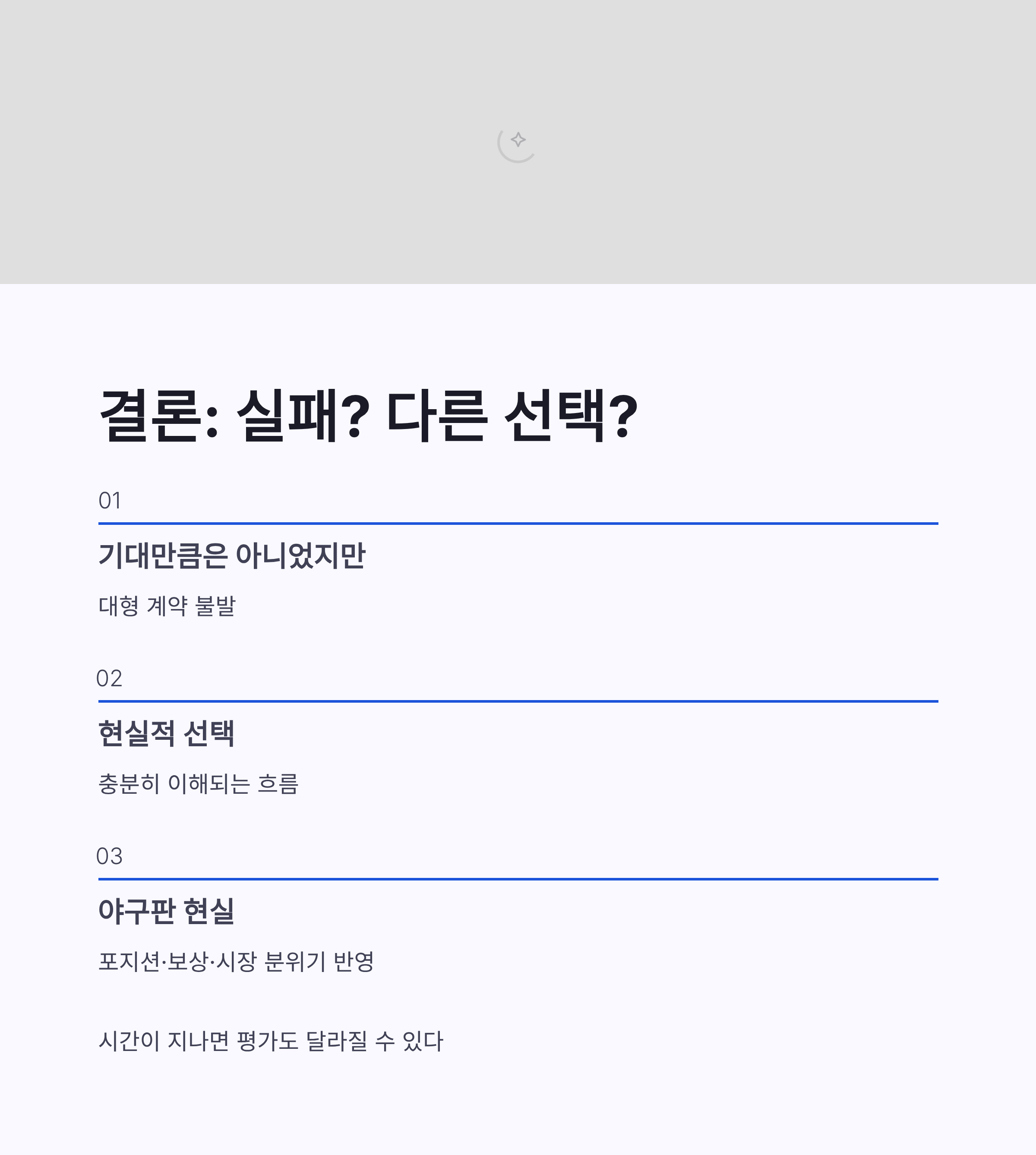 결국 조상우 FA를 두고 성공이냐 실패냐 단정 짓긴 어려운 것 같아요. 기대만큼의 대형 계약은 아니었지만, 현실적인 선택지 안에서는 충분히 이해되는 흐름이었거든요. 이영하 52억과 단순 비교하면 아쉬울 수 있지만, 포지션·보상·시장 분위기까지 보면 조상우 FA는 딱 지금 야구판 현실을 보여주는 사례 같더라구요. 시간이 지나면 평가도 또 달라질지도 모르겠죠. 여러분은 어떻게 보셨나요? 과한 기대였을까요, 아니면 너무 짠 평가였을까요ㅎㅎ