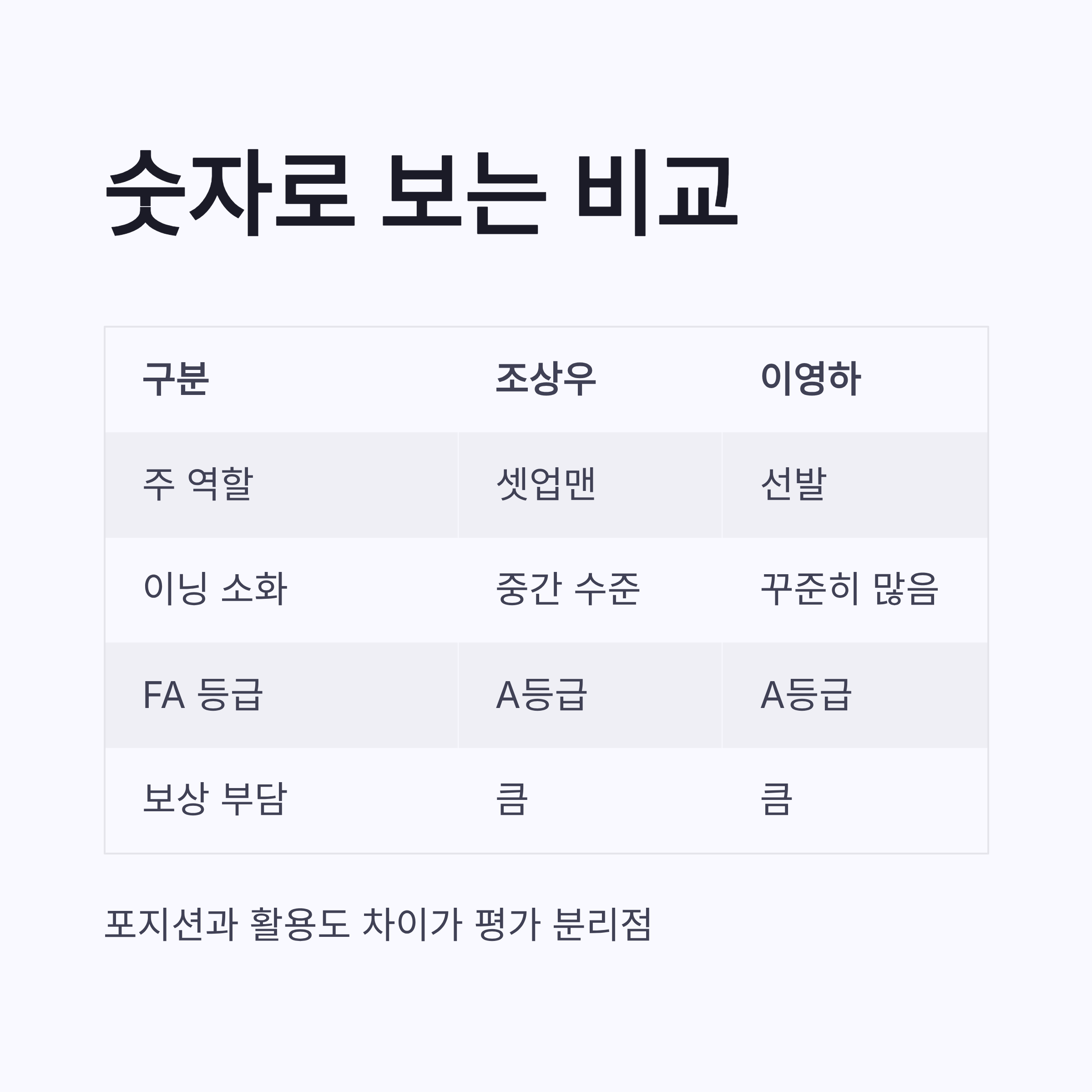 조상우 FA가 이영하와 계속 비교되는 이유는 포지션과 활용도 차이 때문이에요. 이 부분은 감정 빼고 숫자로 보면 좀 냉정해집니다.