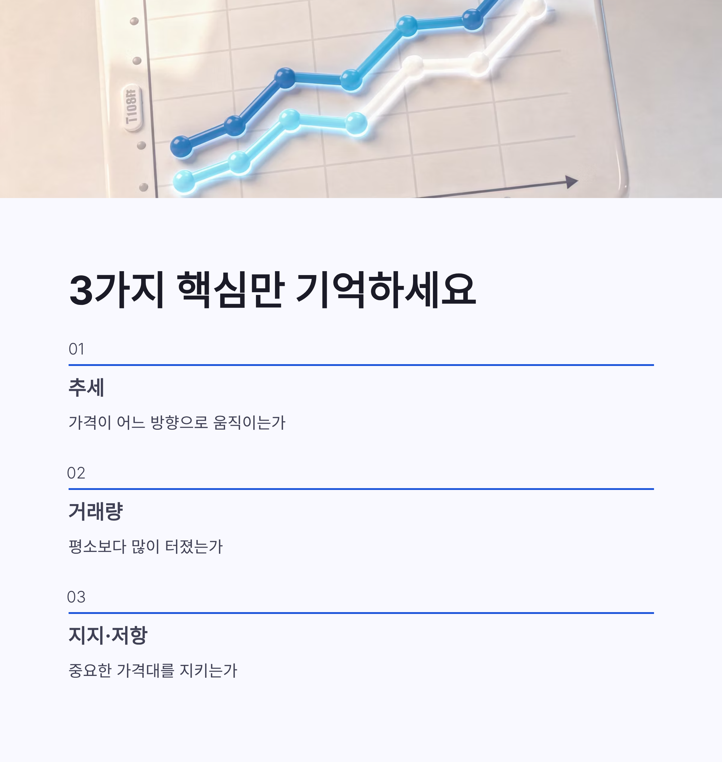 | 거래량 | 평소 대비 증가 | 거래량 터지면 주목 |