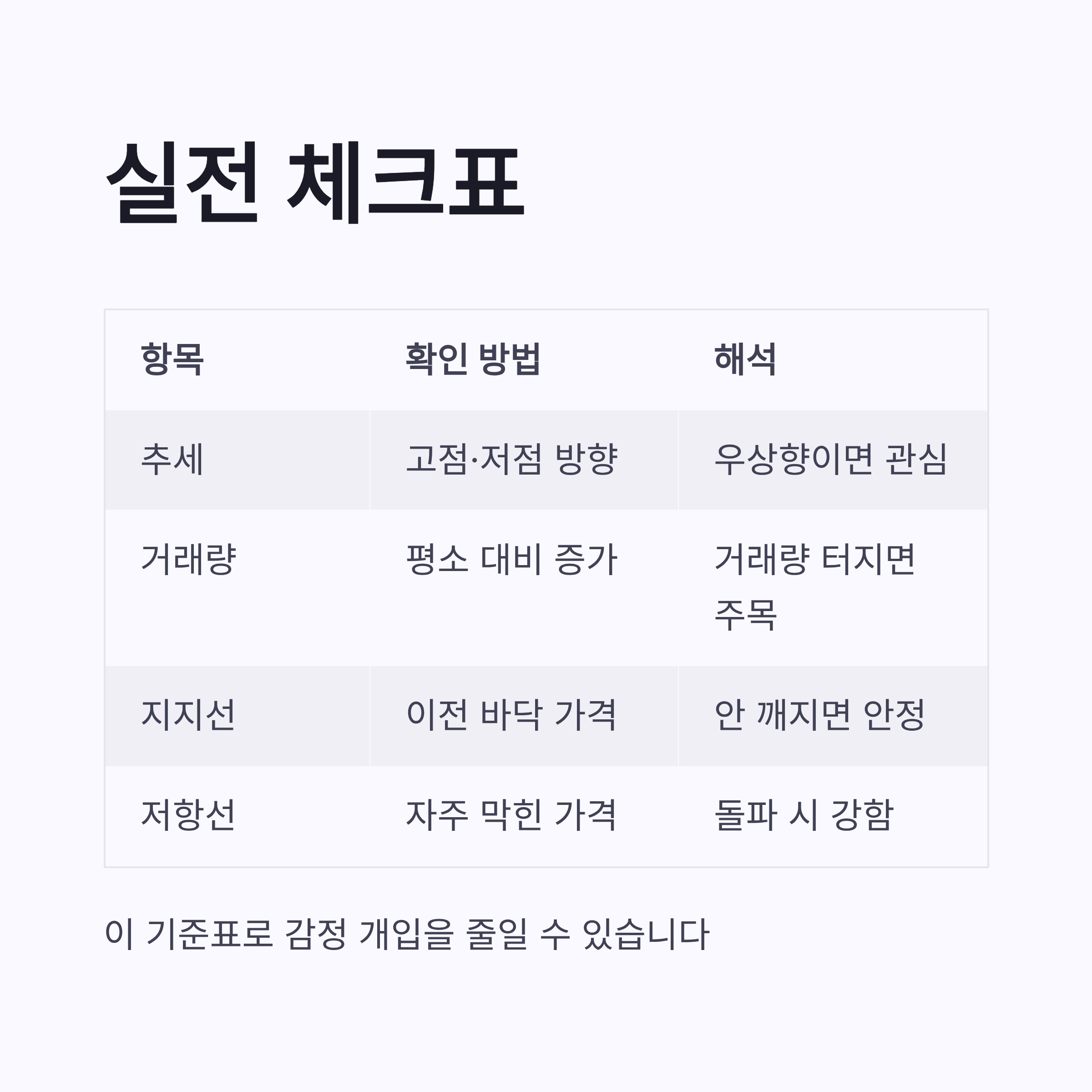 실제로 매수 전에 제가 확인하는 건 아래 정도예요. 주식 차트 보는 법을 배울 때 이런 기준표가 있으면 진짜 편합니다.