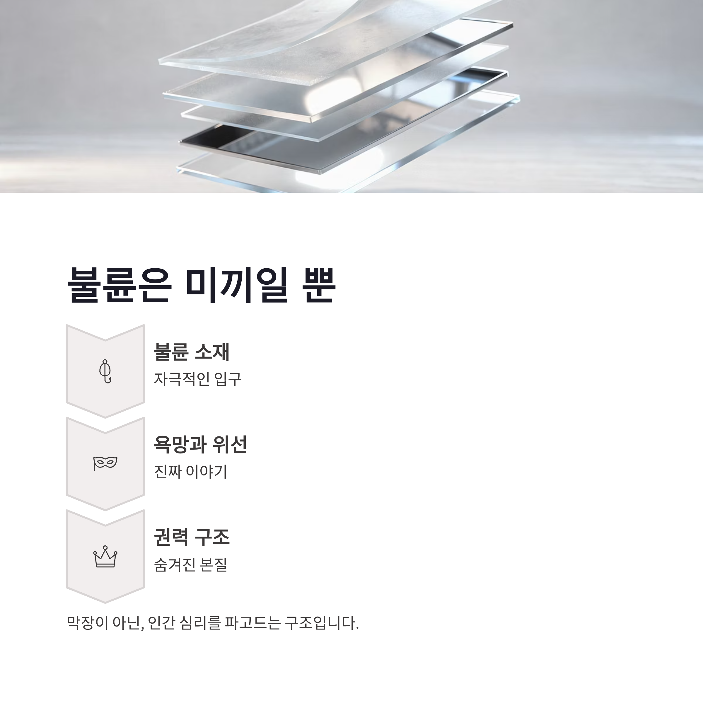 방송 전이라 정보가 막 쏟아지진 않았지만, 현재까지 공개된 내용만 봐도 방향성이 또렷합니다. 쿠팡플레이가 요즘 오리지널에 힘 제대로 주는 게 느껴지는데, 이번 작품도 그 연장선 같더라구요. 지금 불륜이 문제가 아닙니다는 불륜이라는 소재를 미끼처럼 던지고, 그 뒤에 더 큰 욕망과 위선을 하나씩 까보는 구조라고 하더라구요. 그냥 막장으로 안 가겠다는 선언 같은 느낌.