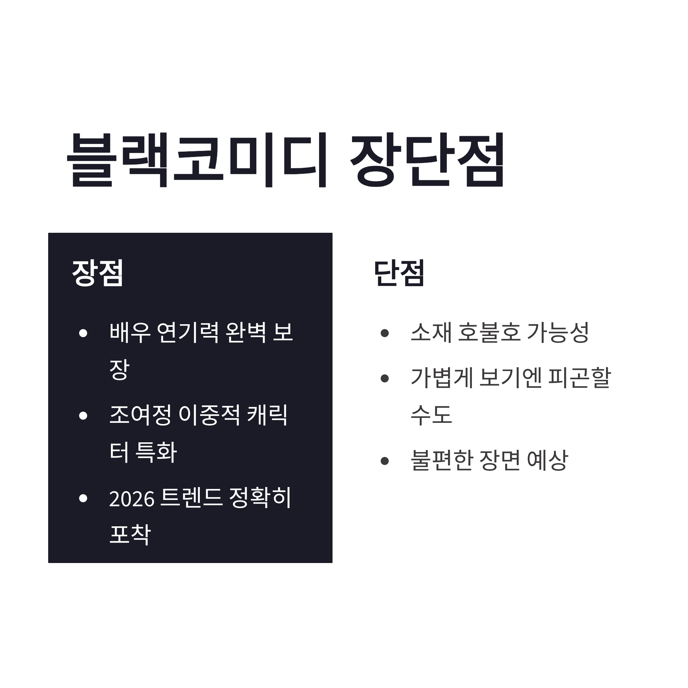 요즘 드라마들 보면 착한 이야기보다 불편한 이야기들이 더 오래 남더라구요. 이 작품도 딱 그 라인입니다. 장점부터 보면, 배우 연기력에 대한 불안이 전혀 없다는 점. 특히 조여정은 이런 이중적인 캐릭터 진짜 잘 소화하잖아요. 반면 단점이라면, 소재 자체가 호불호 갈릴 수 있다는 점 정도? 가볍게 보기엔 살짝 피곤할 수도 있겠다는 생각은 들었습니다. 그래도 2026년 드라마 트렌드가 ‘불편하지만 웃긴 이야기’ 쪽으로 가고 있어서, 흐름은 잘 탄 작품 같더라구요. 쿠팡플레이 쪽에서도 이걸 전략작으로 밀 가능성 높아 보였구요.