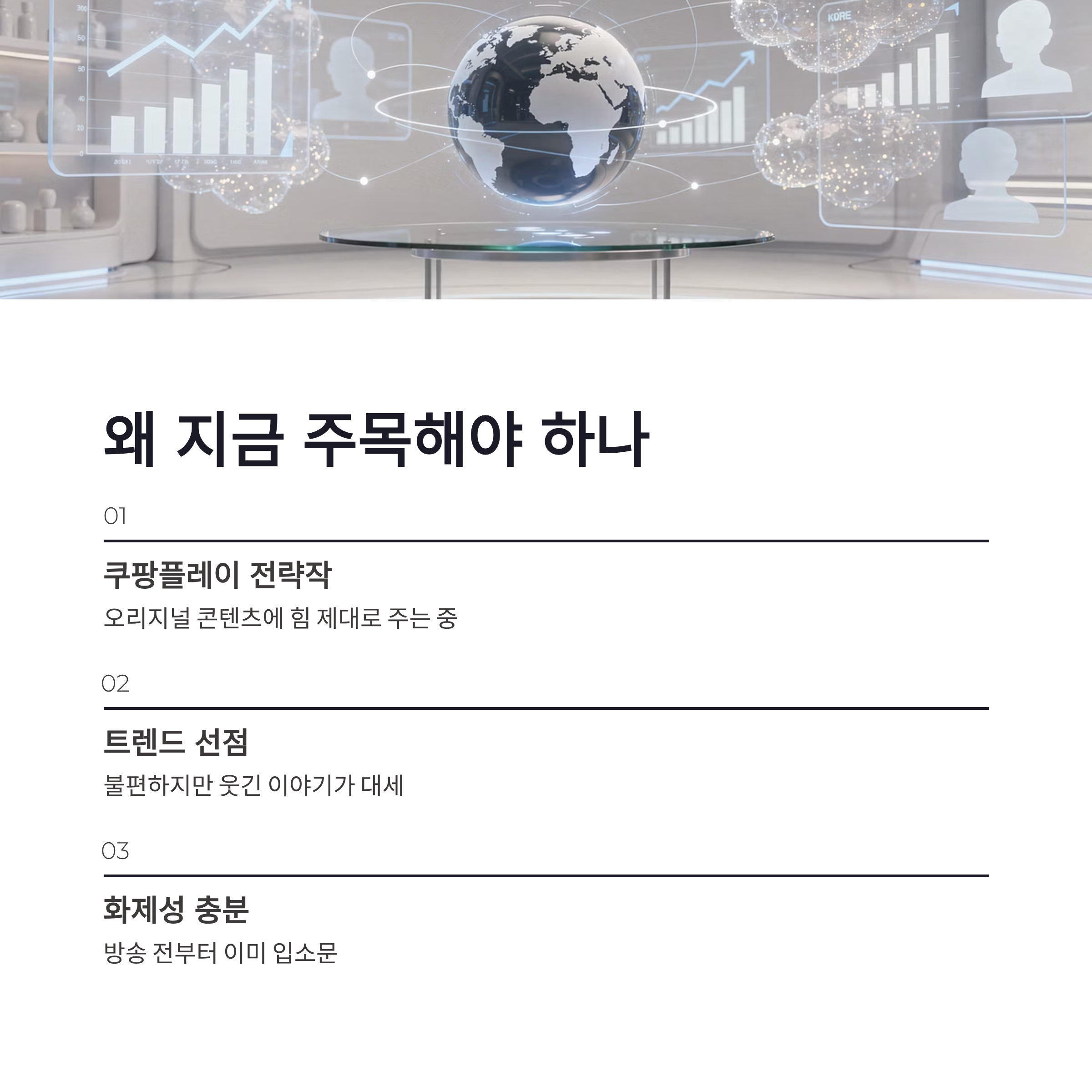 연관해서 많이 언급되는 키워드는 쿠팡플레이 오리지널, 2026년 기대 드라마, 블랙코미디 드라마 이런 쪽이었구요. 체감상 화제성은 이미 충분해 보였습니다.