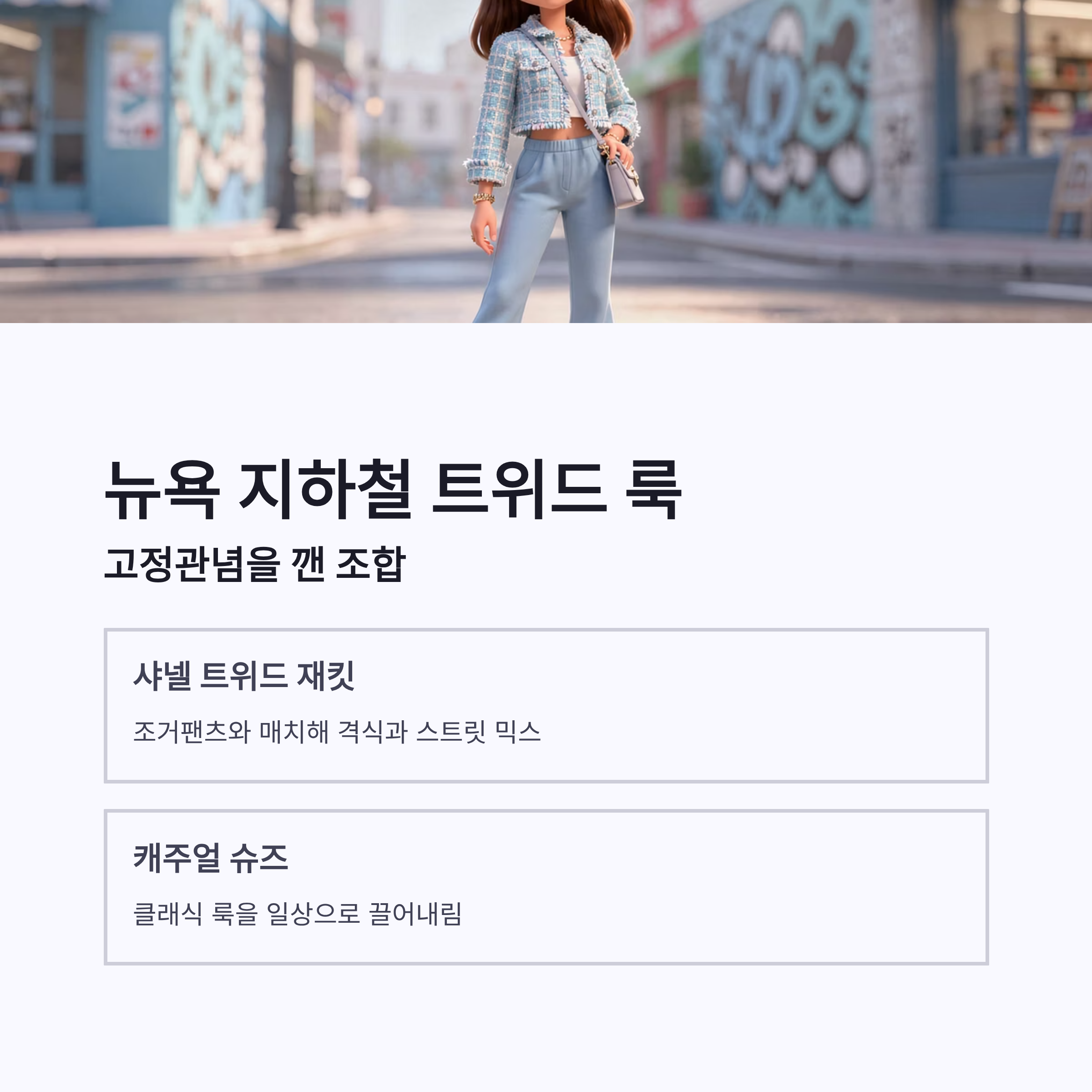 | 샤넬 트위드 재킷 | 조거팬츠 | 격식+스트릿 믹스 |