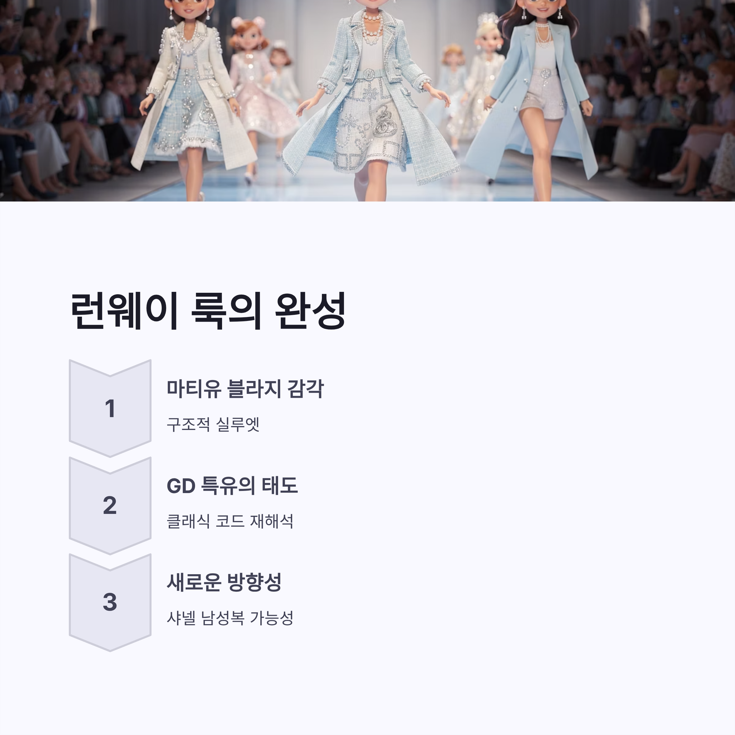 본 무대였던 지드래곤 샤넬 공방 컬렉션 런웨이 룩은 또 다른 결이었어요. 디자이너 마티유 블라지의 감각이 녹아든 구조적인 실루엣, 거기에 GD 특유의 태도가 더해졌달까. 장점부터 말하면, 클래식한 샤넬 코드가 전혀 낡아 보이지 않았다는 점! 반대로 단점이라면… 솔직히 일반인이 소화하기엔 난이도가 꽤 높다는 거 ㅠㅠ 그래도 확실한 건, 지드래곤 샤넬 공방 컬렉션을 통해 “샤넬은 여성복 브랜드”라는 인식이 또 한 번 깨졌다는 느낌이었어요. 이건 트렌드라기보다 방향성 같더라구요.