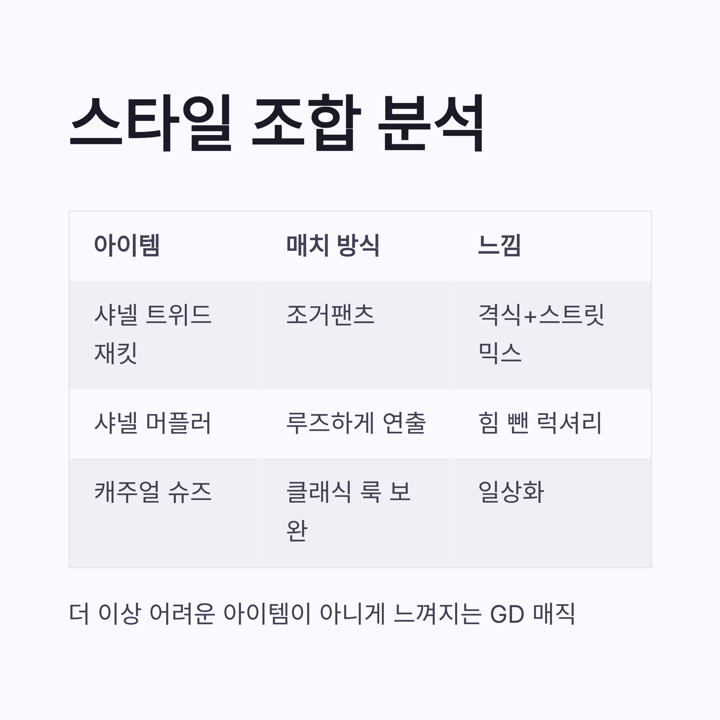 | 아이템 | 매치 방식 | 느낌 |