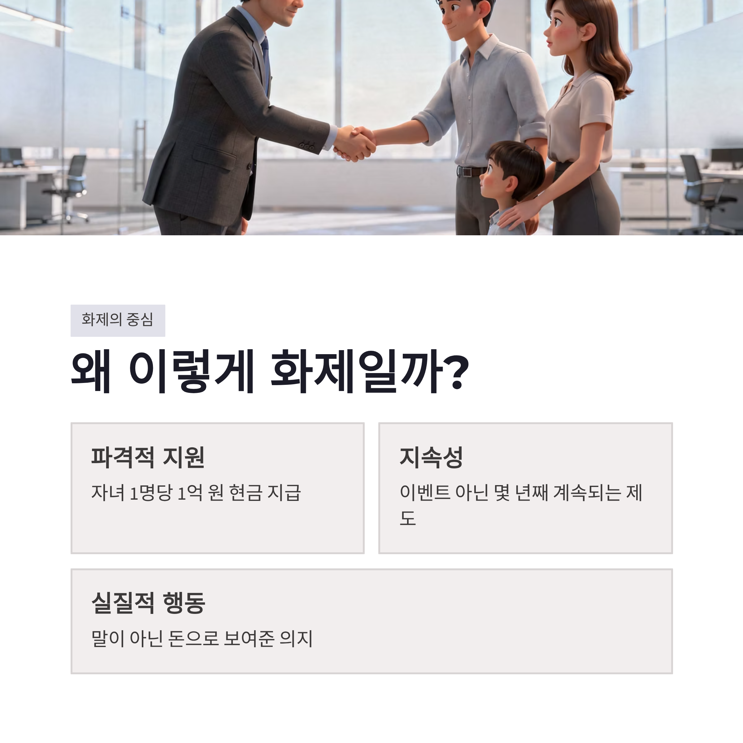 요즘 뉴스 보다 보면 부영그룹 출산장려금 이야기가 꼭 한 번씩은 나오더라구요. 저도 처음엔 “설마 진짜로?” 싶었는데, 이게 말 그대로 직원 자녀 1명당 1억 원 지급이더라구요. 이벤트성도 아니고 몇 년째 계속 이어지는 제도라 더 놀랐습니다. 2026년 기준으로 누적 지급액이 100억 원을 돌파했다는 점에서, 그냥 이미지용 정책은 아닌 느낌이었어요. 솔직히 저출생 얘기만 나오면 다들 고개부터 젓잖아요. 근데 부영그룹은 말이 아니라 돈으로 보여줬다는 점에서 체감이 확 오더라구요. 회사 입장에서 쉬운 결정은 아니었을 텐데, 이 정도면 내부에서도 꽤 큰 결단이었겠다 싶었습니다.