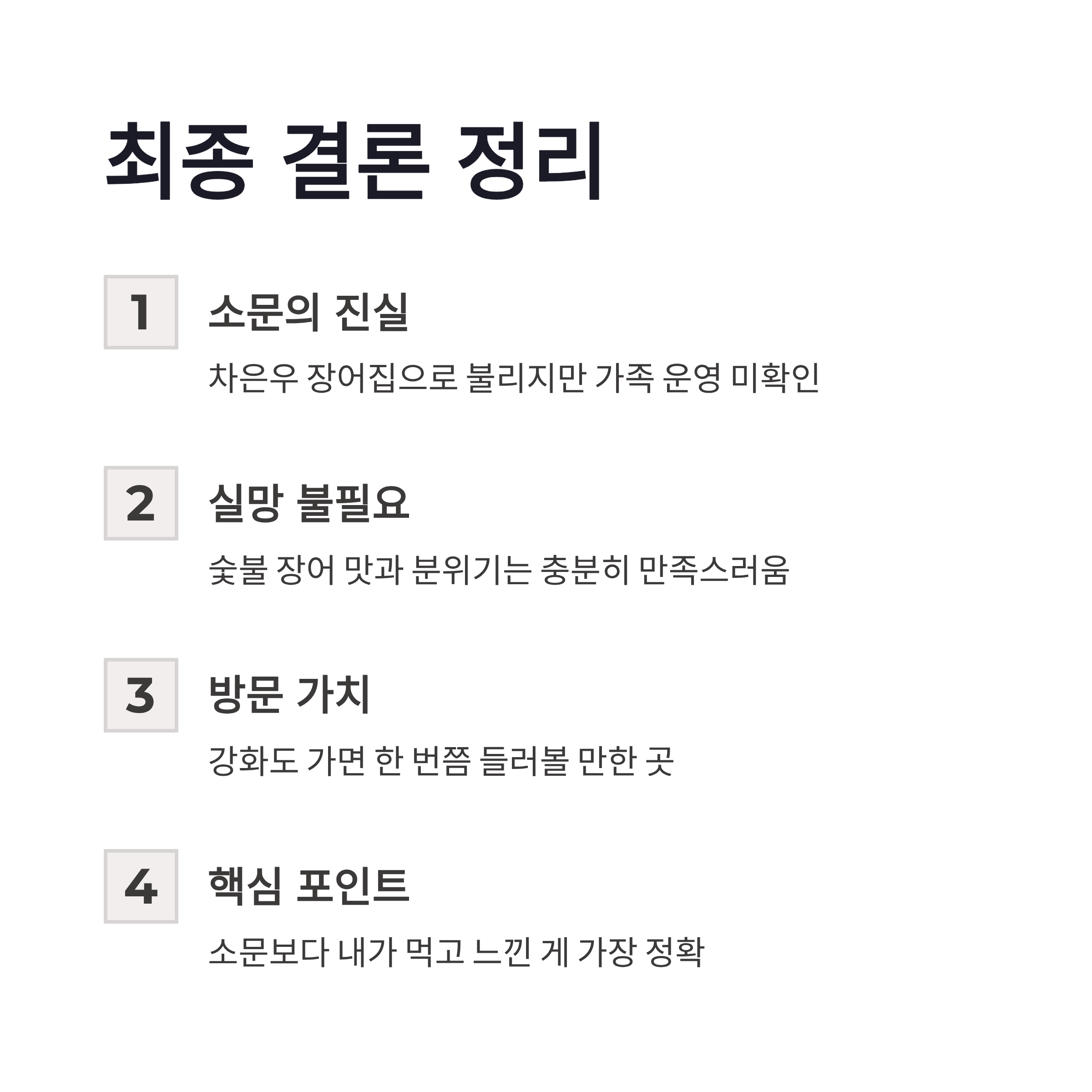 정리해보면, 어제연숯불장어는 차은우 장어집이라 불릴 만큼 화제가 된 건 맞지만, 가족 운영 여부는 확인된 바 없어요. 그렇다고 실망할 필요는 없었구요. 숯불에 구워 나오는 장어 퀄리티, 과하지 않은 가격, 조용한 분위기까지 생각하면 강화도 가면 한 번쯤 들러볼 만한 집이긴 했습니다. 개인적으로는 “연예인 가족 식당” 기대보다는 강화도 장어 맛집으로 접근하는 게 훨씬 만족도가 높았구요. 괜히 소문에 휘둘리기보단, 내가 먹고 느낀 게 제일 정확하더라구요 ㅎㅎ