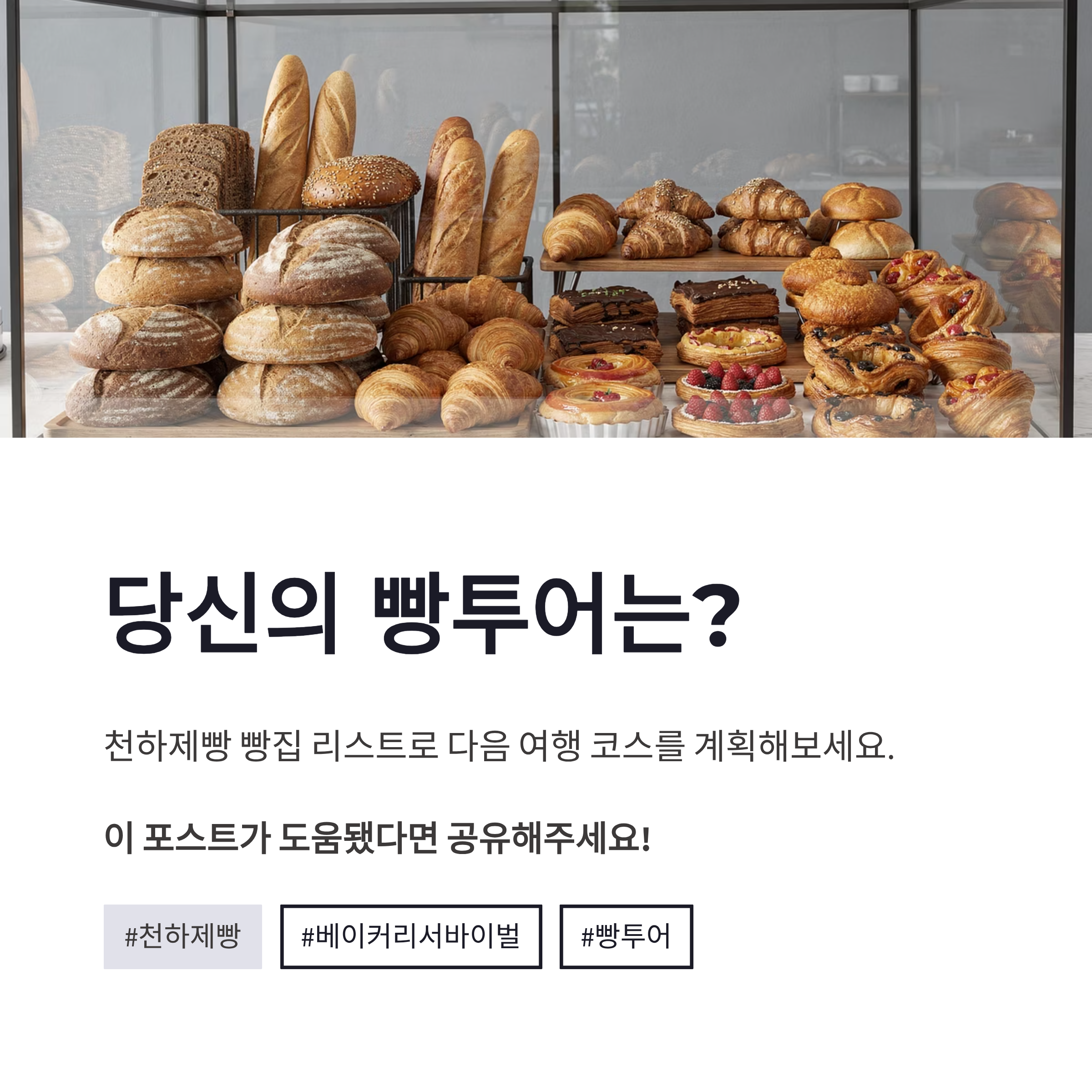 정리해보면 천하제빵은 단순 예능이 아니라, 제과제빵 업계 판 자체를 한 번 흔들어 놓은 느낌이에요. 빵집 리스트, 위치, 출연진 라인업만 봐도 실제 방문 욕구가 확 올라가구요. 방송 이후에는 웨이팅, 품절, 예약 난이도까지 다 바뀔 것 같더라구요 ㅎㅎ 저는 개인적으로 천하제빵 빵집 리스트 보면서 다음 빵투어 코스부터 짜고 있었습니다. 이거 은근 위험한 프로그램이에요. 지갑도, 다이어트도 같이 흔들림…ㅋㅋ 여러분은 어떤 지역 빵집이 제일 궁금하신가요?