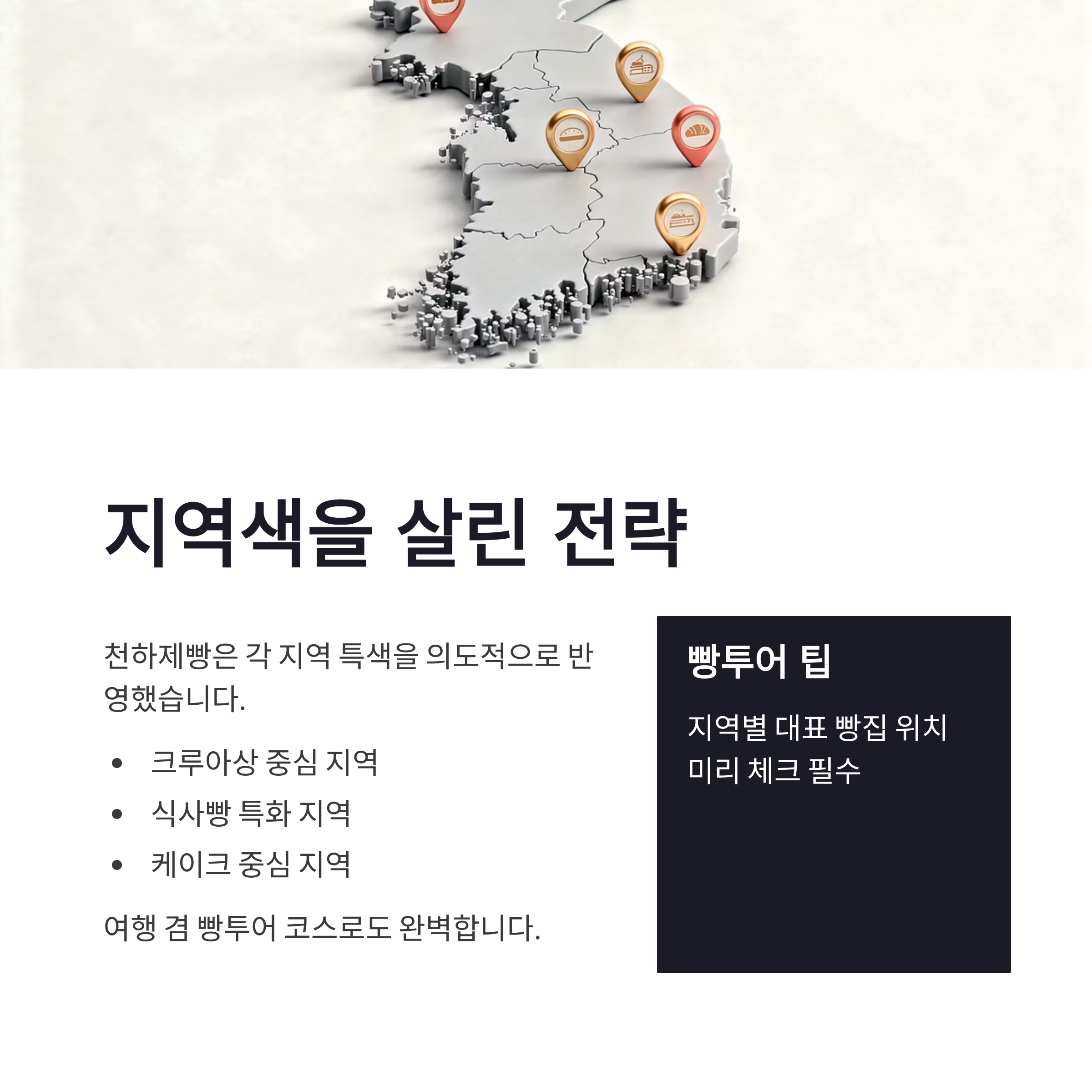 | 지역 | 특징 | 체감 포인트 | | -- | ------- | --------- | | 서울 | 트렌디·실험적 | 식감·비주얼 경쟁 | | 부산 | 발효·식사빵 | 담백함, 밀도 | | 대구 | 클래식 제과 | 기본기 탄탄 | | 전주 | 지역 재료 | 로컬 스토리 | | 제주 | 천연 발효 | 개성 강함 |