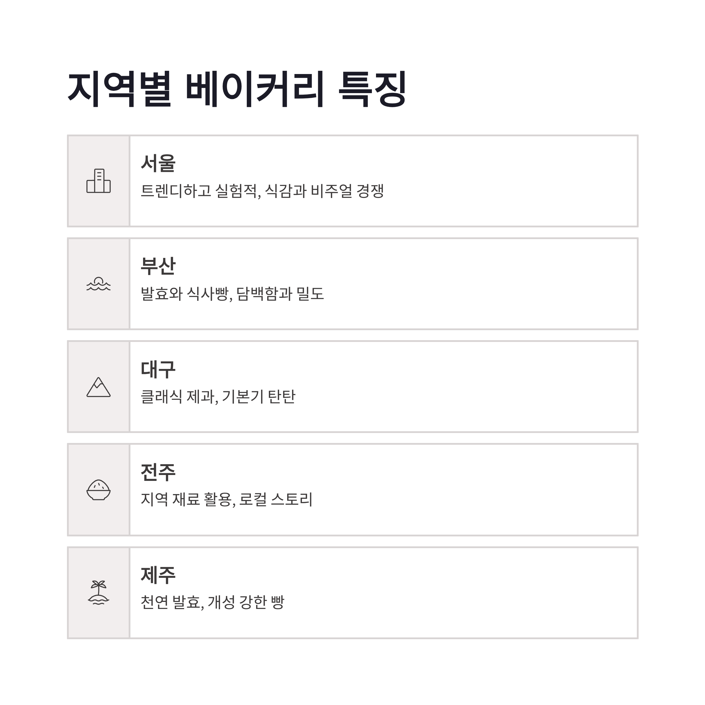 | 지역 | 특징 | 체감 포인트 | | -- | ------- | --------- | | 서울 | 트렌디·실험적 | 식감·비주얼 경쟁 | | 부산 | 발효·식사빵 | 담백함, 밀도 | | 대구 | 클래식 제과 | 기본기 탄탄 | | 전주 | 지역 재료 | 로컬 스토리 | | 제주 | 천연 발효 | 개성 강함 |