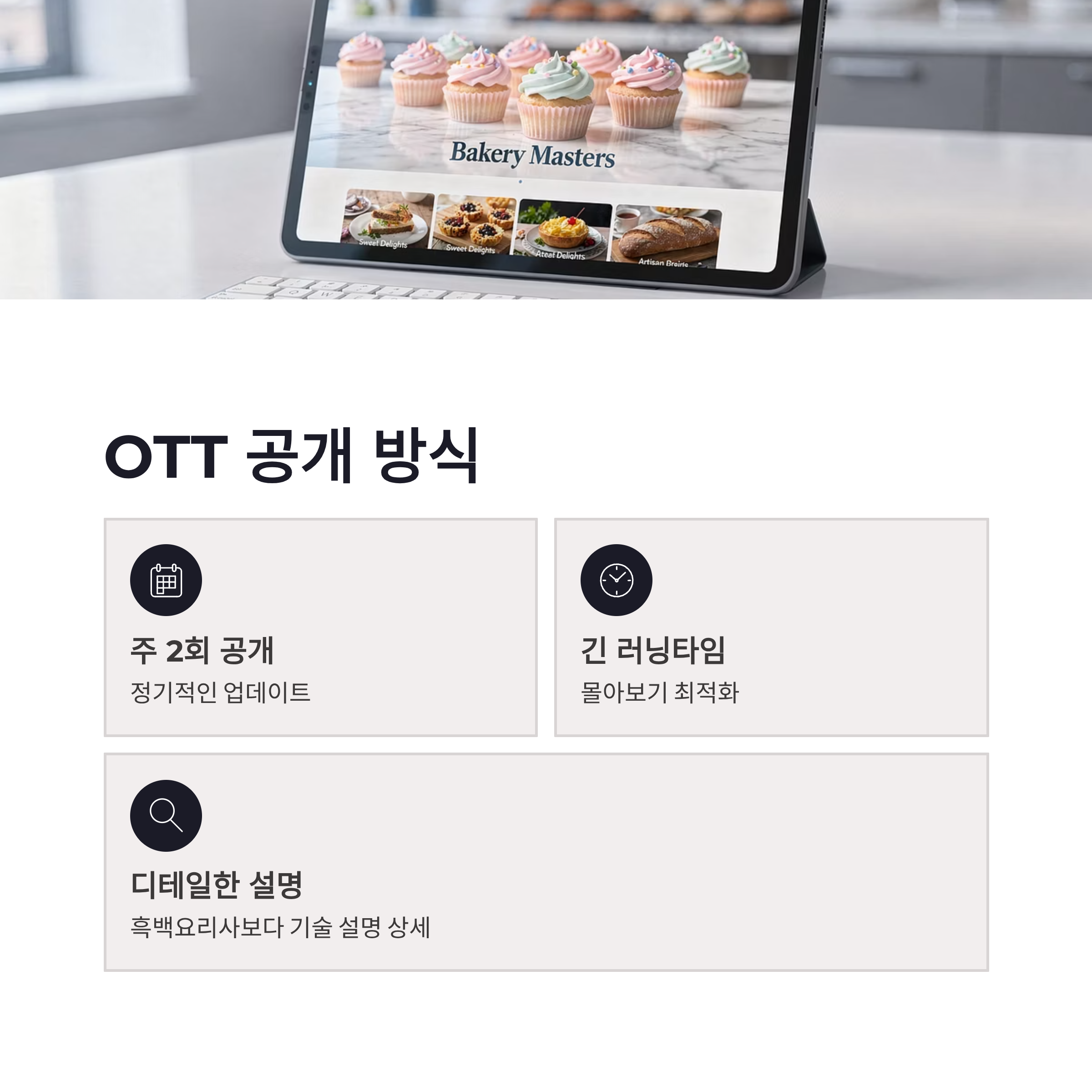 OTT 공개 방식도 요즘 트렌드 그대로입니다. 주 2회 공개, 회차당 러닝타임 긴 편이라 몰아보기 각이구요. 개인적으로는 흑백요리사보다 기술 설명이 더 디테일하다는 느낌을 받았습니다. 장점은 몰입감, 단점은… 배고파짐 ㅠㅠ 그래도 천하제빵은 빵 좋아하는 사람이라면 절대 그냥 넘기기 힘든 콘텐츠인 건 확실합니다.