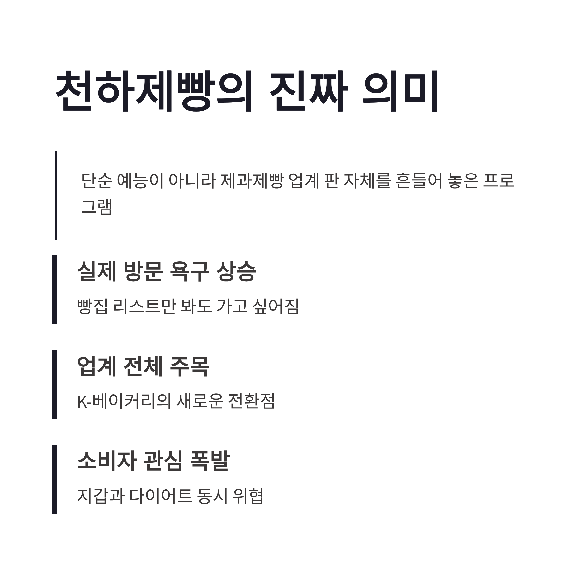제가 느낀 건, 천하제빵이 지역색을 일부러 살렸다는 점이에요. 어디는 크루아상, 어디는 식사빵, 또 어디는 케이크 중심. 여행 겸 빵투어 코스로 짜도 충분히 재미있겠더라구요. 연관 키워드로 많이 나오는 *천하제빵 빵집 위치, 천하제빵 출연 베이커리 지도* 이런 게 왜 뜨는지 이해됐습니다.