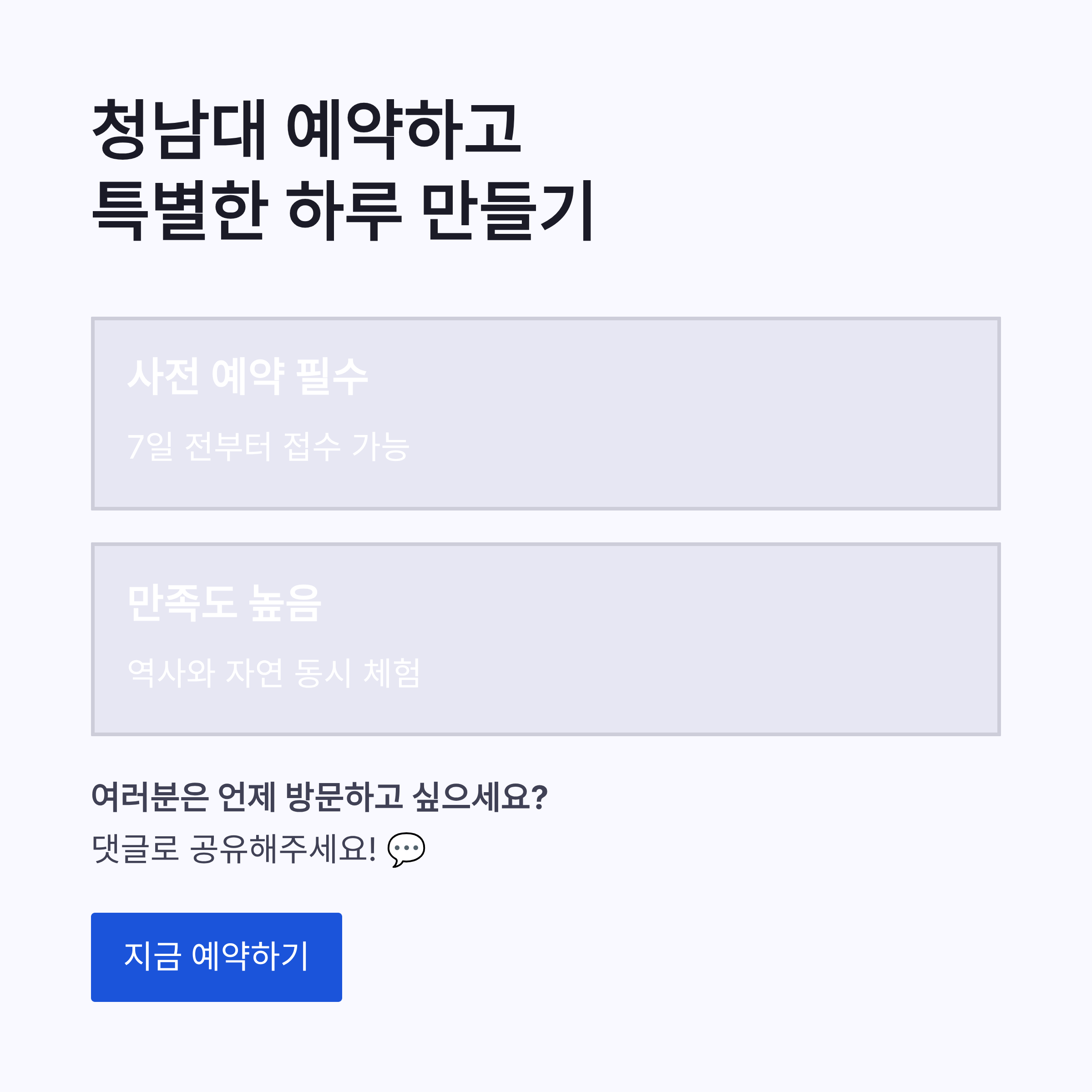 단체 방문하면 추가 할인도 있고, 이벤트 할인도 가끔 있어서 청남대 예약 전에 꼭 체크해보는 게 좋아요. 참고로 12~1월 겨울철엔 안전 문제로 온라인 예약이 중단되는 시기도 있어서 이 부분은 진짜 주의해야겠더라구요. 저도 이거 모르고 날짜 잡았다가 일정 바꿨었음요 ㅠㅠ