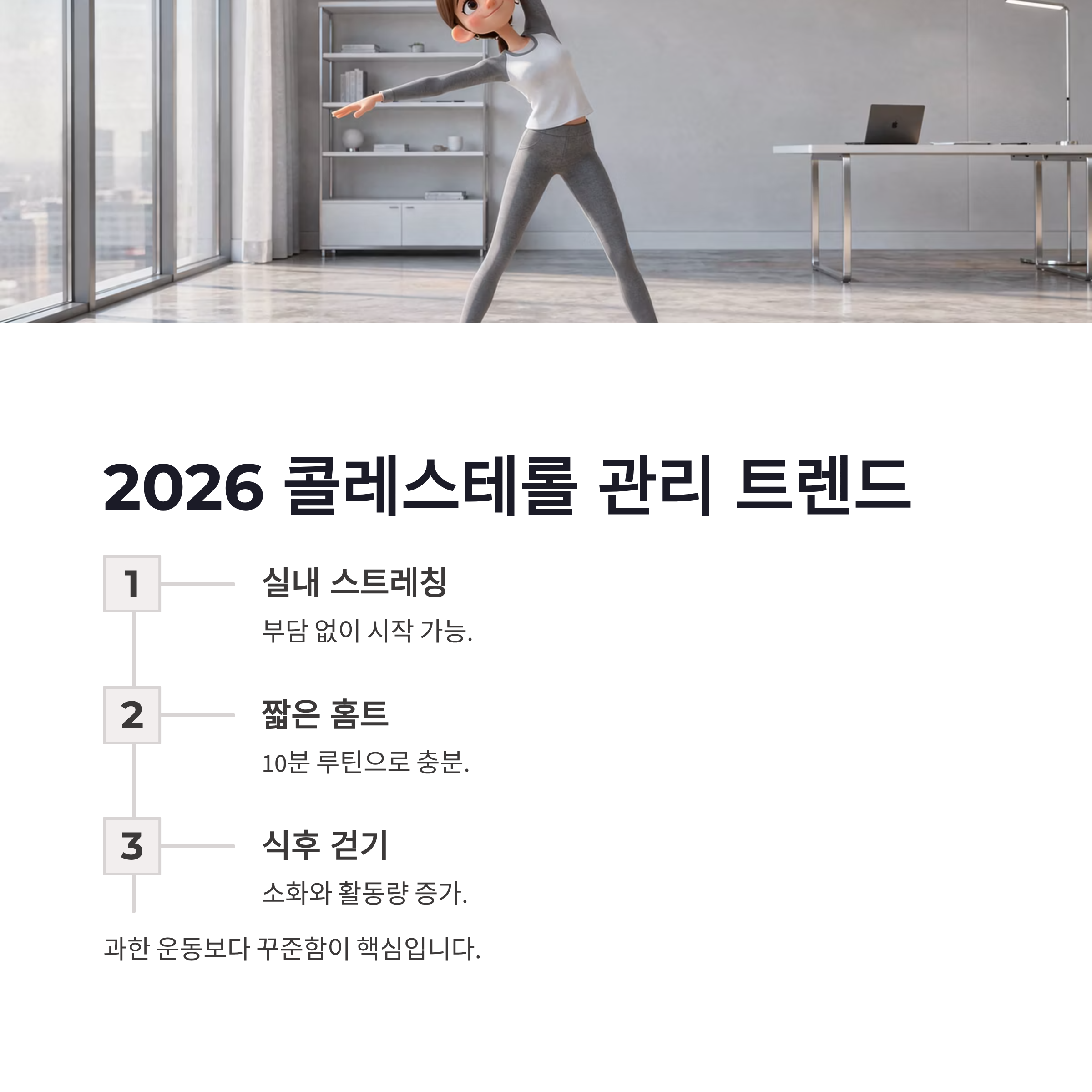 2026년 들어서 콜레스테롤 관리 트렌드는 확실히 “과한 운동보다 꾸준함” 쪽으로 바뀐 느낌이에요. 실내 스트레칭, 짧은 홈트, 식후 10분 걷기 같은 루틴이 많이 언급되더라구요. 장점은 부담이 적고 오래 간다는 점! 단점이라면… 눈에 띄는 변화가 느리다는 거 ㅠㅠ 그래도 겨울철엔 이게 현실적인 선택 같았습니다. 저도 아침에 일어나서 5분 스트레칭, 식사 후 제자리 걷기만 해도 몸이 덜 굳는 느낌이 들었거든요. 이런 루틴이 쌓이면 결국 콜레스테롤 관리에도 영향을 주겠쥬.