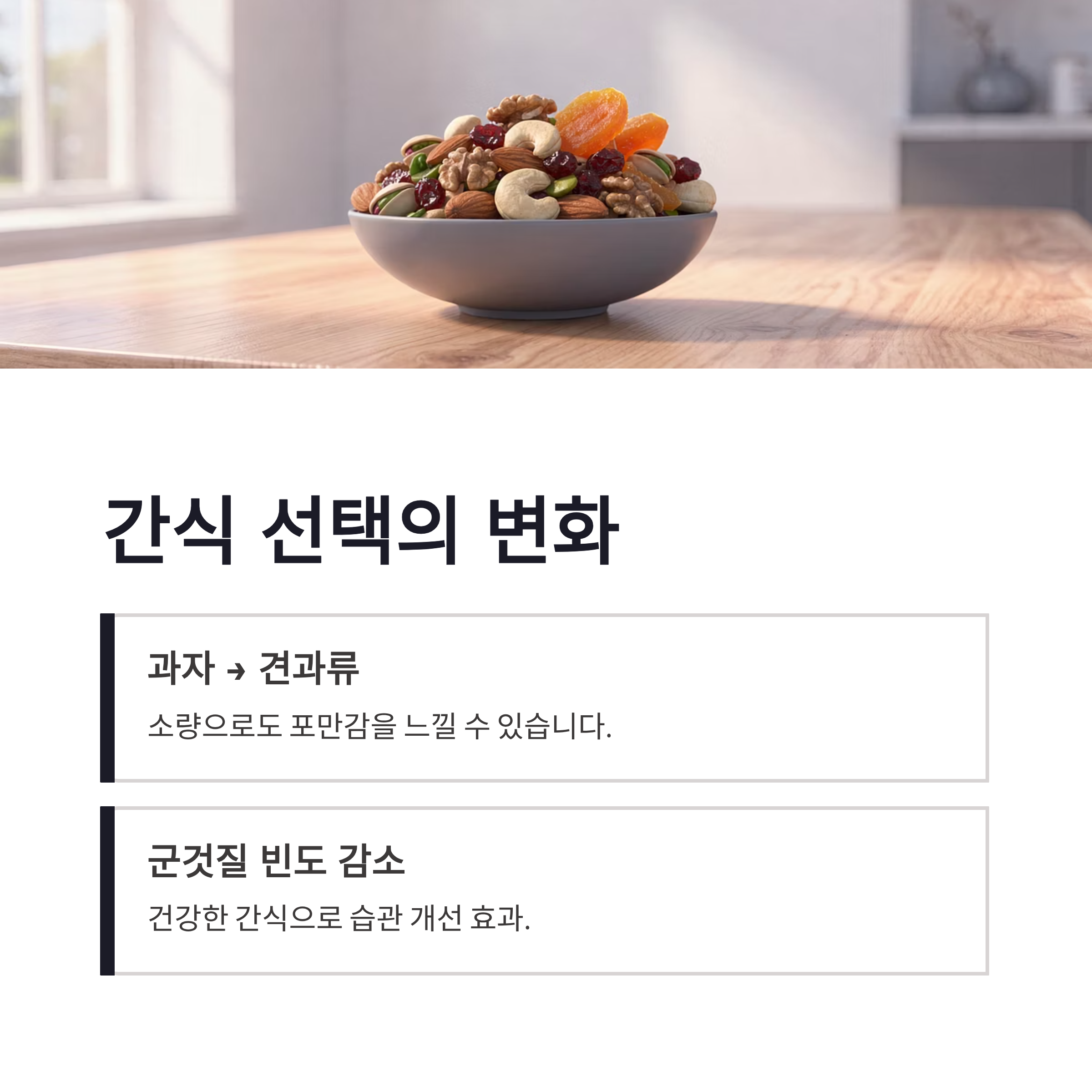 | 간식 | 과자 → 견과류 소량 | 군것질 빈도 감소 |
