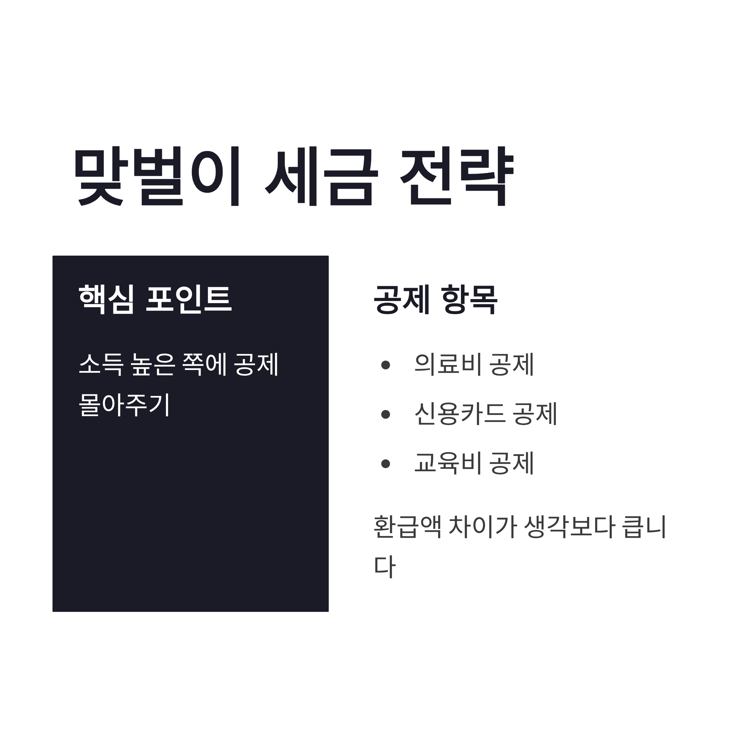 또 맞벌이라면 의료비, 카드 공제는 소득이 높은 쪽에 몰아서 적용하는 전략이 유리한 경우가 많았어요. 저는 처음에 반반 나눴다가 체감 환급액 차이를 보고 다시 조정했었거든요.