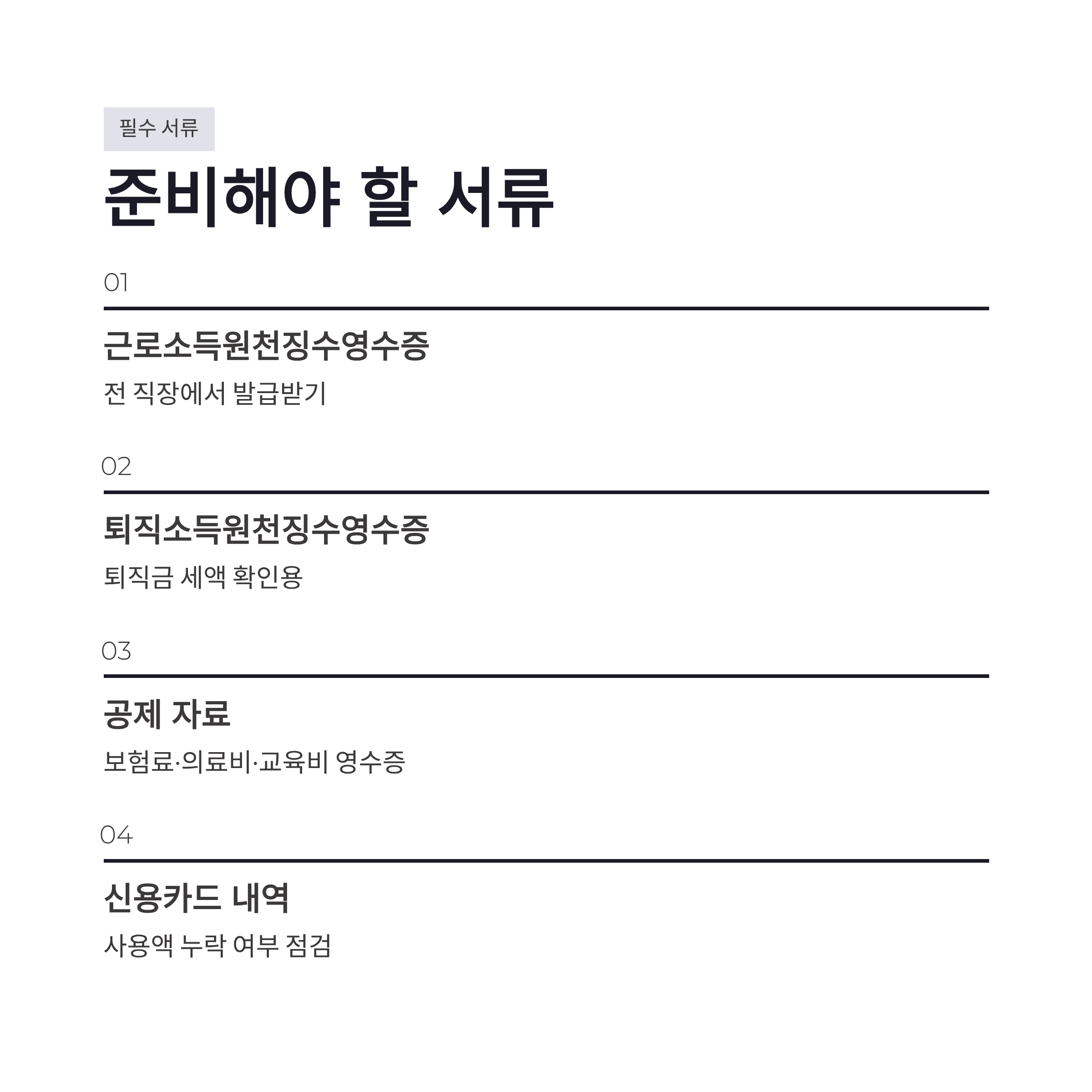 | 공제 자료 | 보험료·의료비·교육비 영수증 | 홈택스 간소화 확인 |