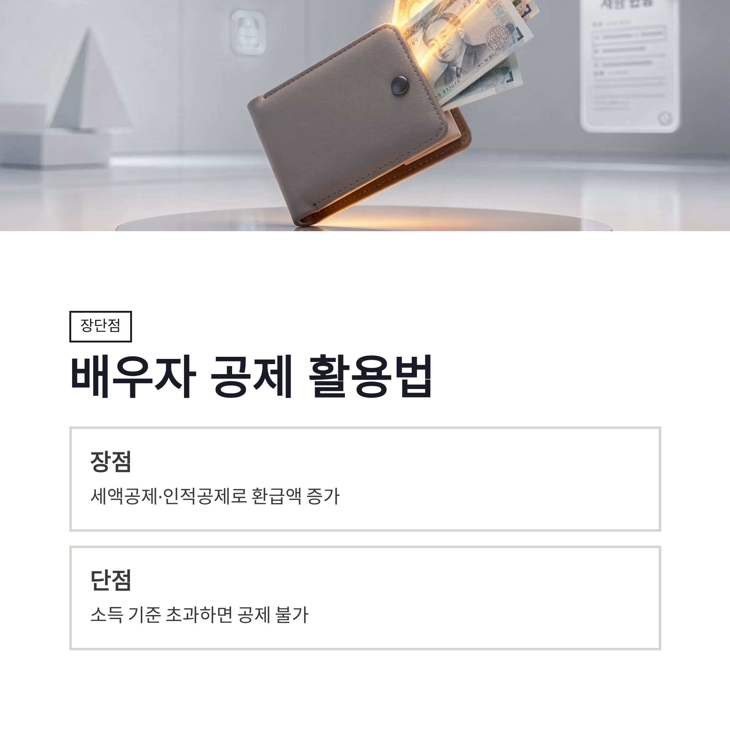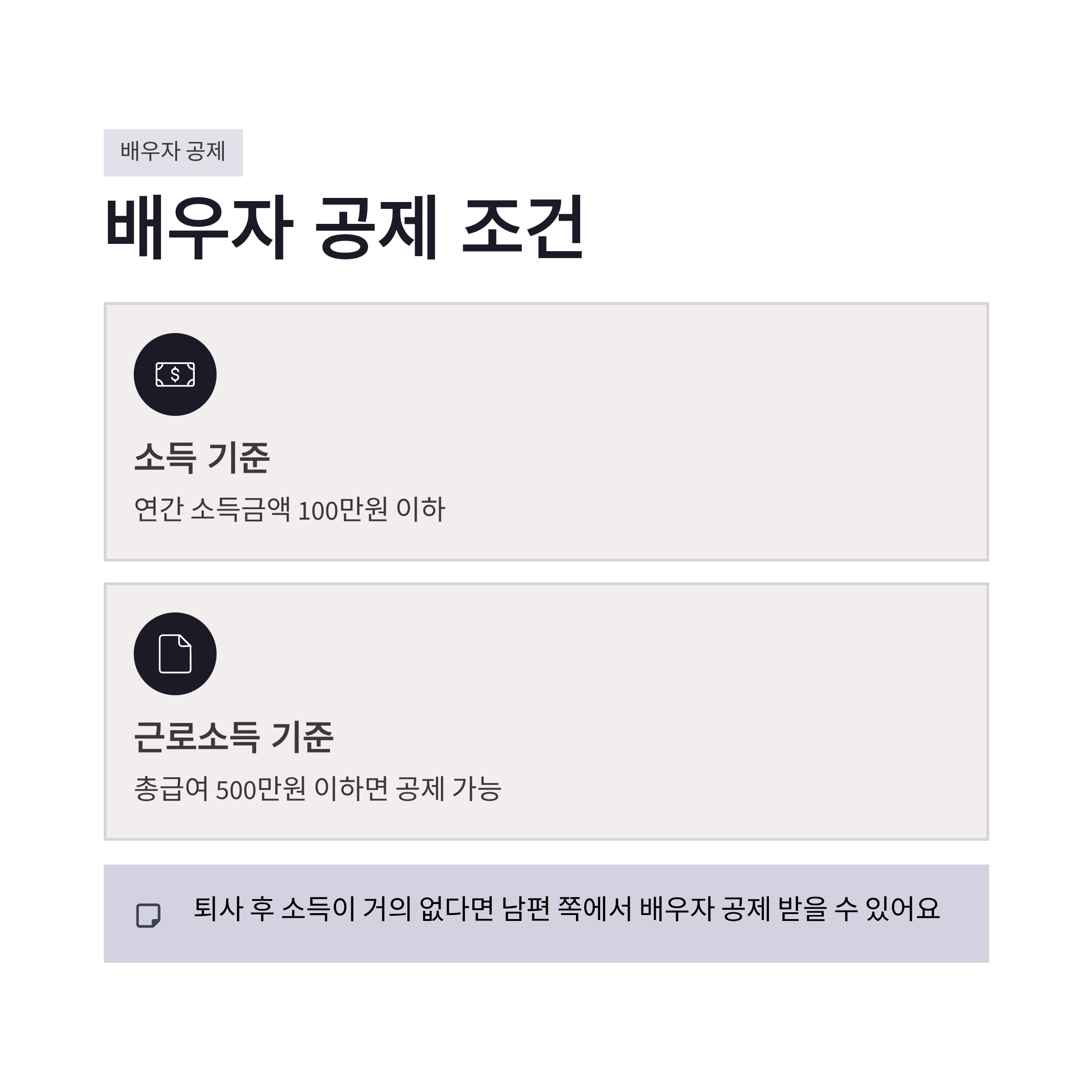 먼저, 배우자는 원칙적으로 서로 인적공제 대상이 되려면 연간 소득금액 100만원 이하(근로소득만 있을 경우 총급여 500만원 이하)여야 합니다. 2026년 기준도 동일해요. 만약 내가 퇴사 후 소득이 거의 없었다면 남편 쪽에서 배우자 공제를 받을 수 있는 구조가 되죠.