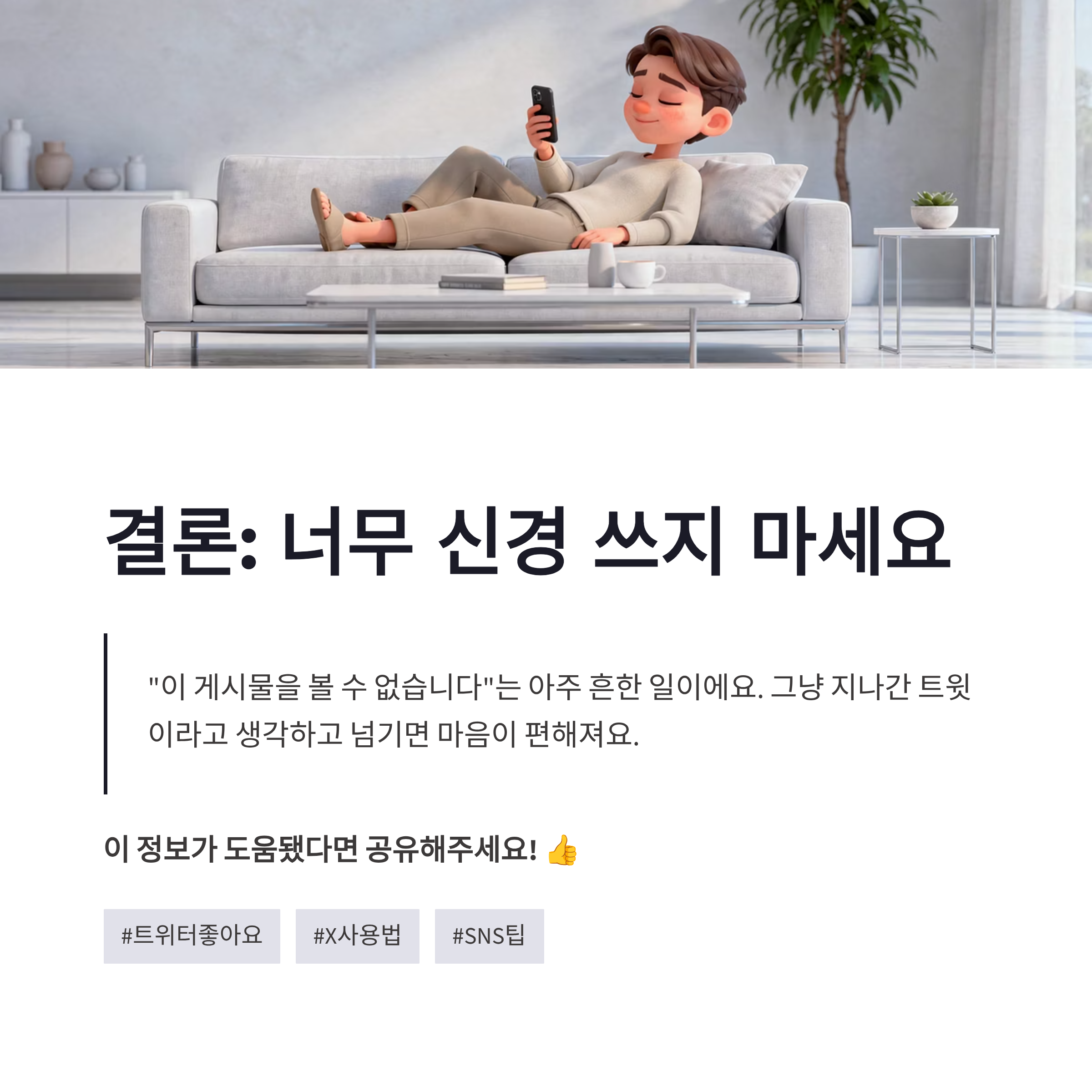 정리하자면, 트위터 좋아요 목록에서 “이 게시물을 볼 수 없습니다”가 뜨는 건 아주 흔한 일이에요. 트윗 삭제, 비공개 전환, 차단, 계정 정지 같은 이유가 대부분이고, 내 계정 문제일 가능성은 낮아요. 저도 이거 알고 나서부터는 덜 신경 쓰게 되더라구요. 그냥 “아, 이건 지나간 트윗이구나” 하고 넘기면 마음이 편해짐 ㅎㅎ 혹시 여러분도 좋아요 정리하다가 같은 상황 겪어보셨나요? 다들 어디까지 정리하고 계신지 은근 궁금하네용.