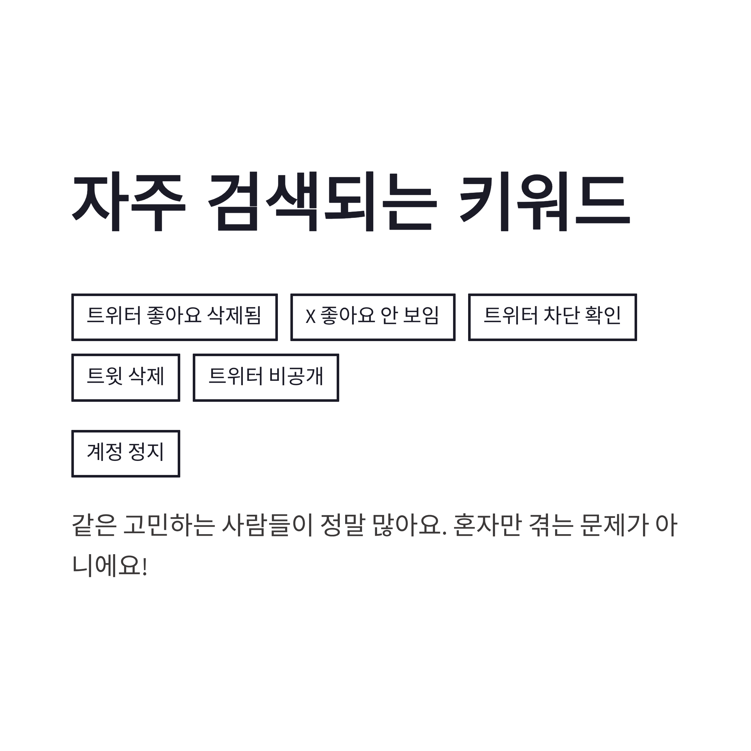 이럴 땐 괜히 “내가 뭐 잘못했나?” 싶어지는데요, 대부분은 내 문제 아님이더라구요. 연관 키워드로 *트위터 좋아요 삭제됨, X 좋아요 안 보임, 트위터 차단 확인* 이런 것도 같이 많이 검색되는 이유가 있었어요.