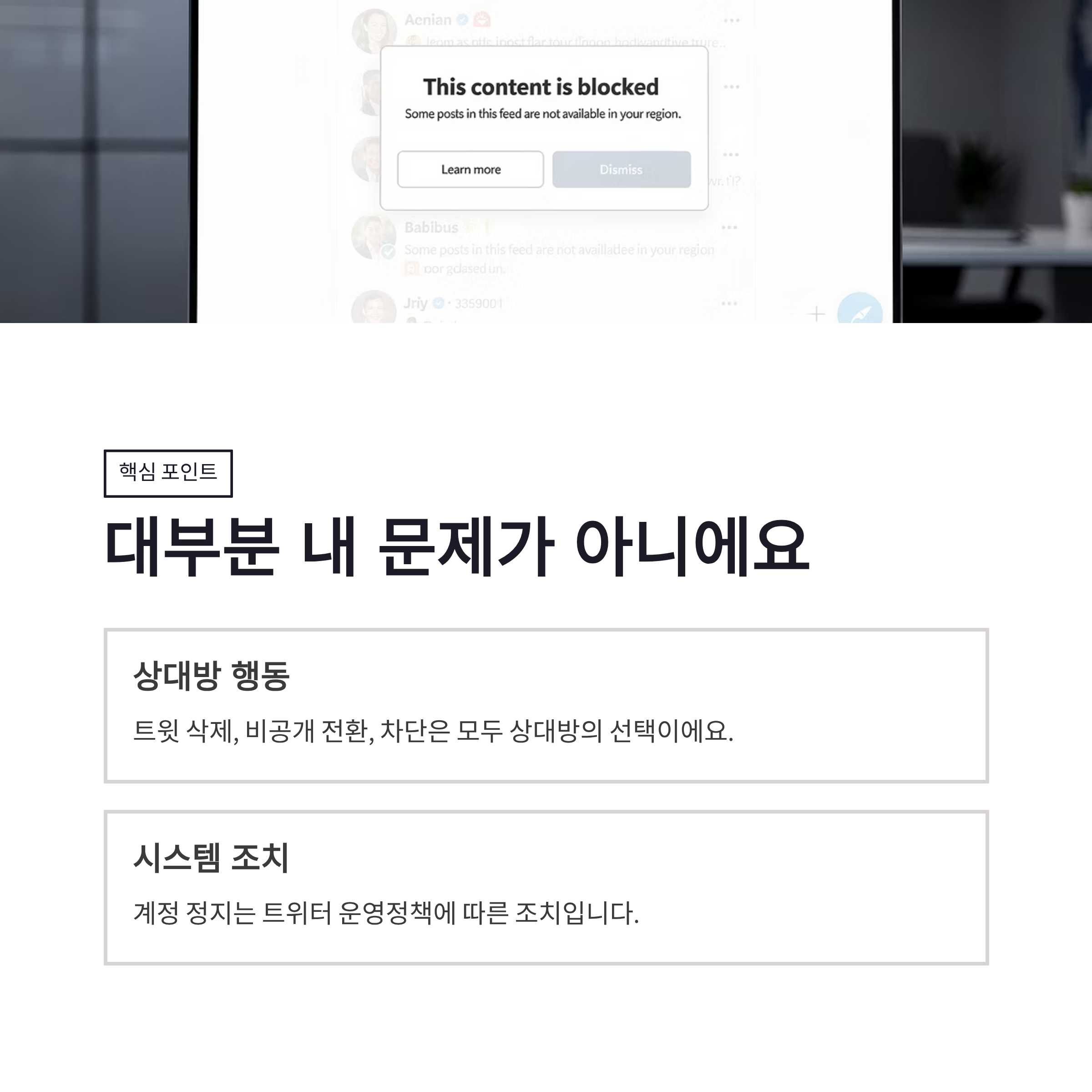 | 계정 정지 | 운영정책 위반 | 트윗 전부 접근 불가 |
