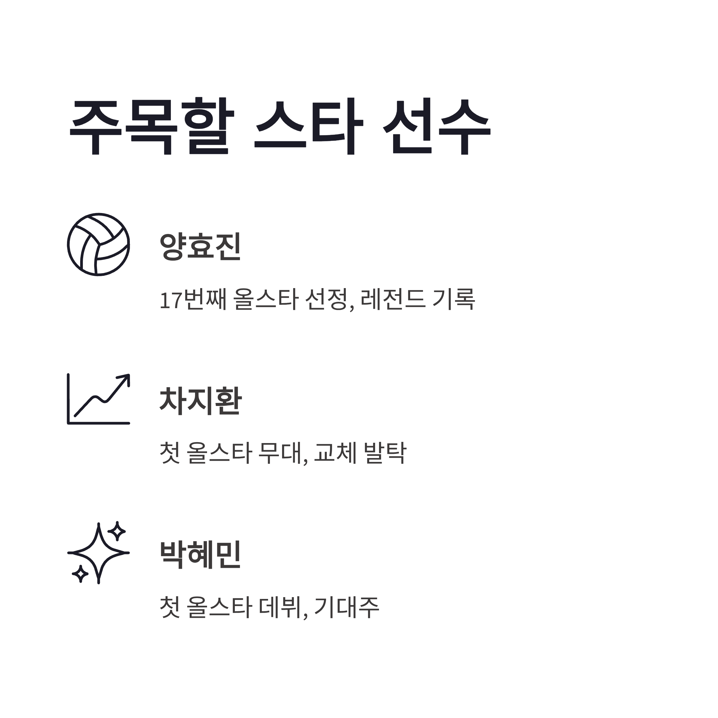 특히 눈여겨볼 포인트는 여자부 양효진의 17번째 올스타 선정, 그리고 교체 발탁된 차지환, 박혜민의 첫 올스타 무대예요. 이런 스토리 있는 경기라서 단순 이벤트전 이상 느낌이더라구요. 장점은 스타 선수 총출동, 팬서비스 풍부함! 단점이라면… 인기 많아서 표 구하기 빡세다는 거 ㅋㅋ