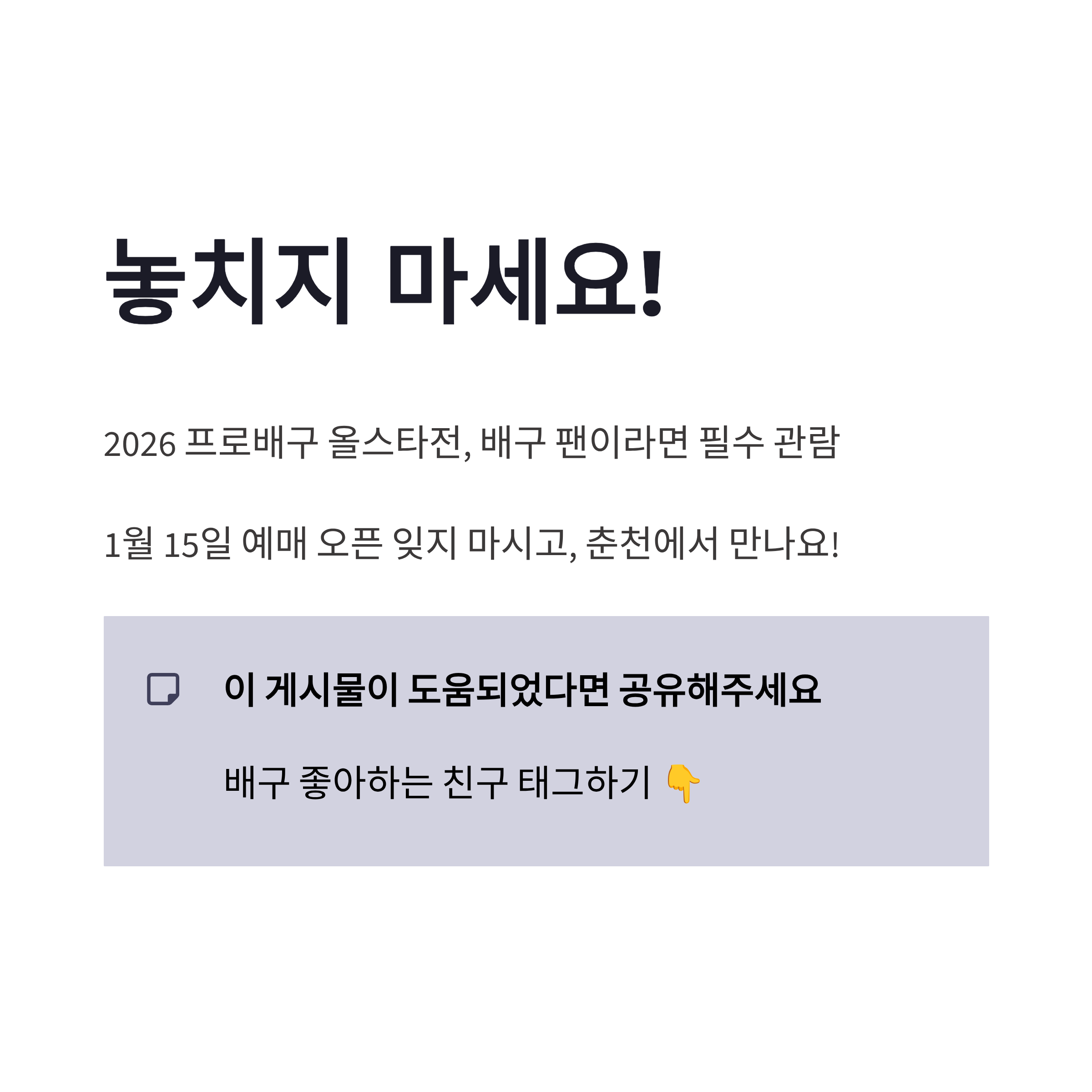 #프로배구올스타전 #V리그올스타전 #프로배구올스타전티켓 #V리그티켓예매 #춘천호반체육관 #2026배구올스타전 #배구올스타전일정 #V리그선발명단 #프로배구경기 #배구팬필수 #겨울스포츠 #국내스포츠이벤트 #배구직관 #스포츠티켓 #V리그팬