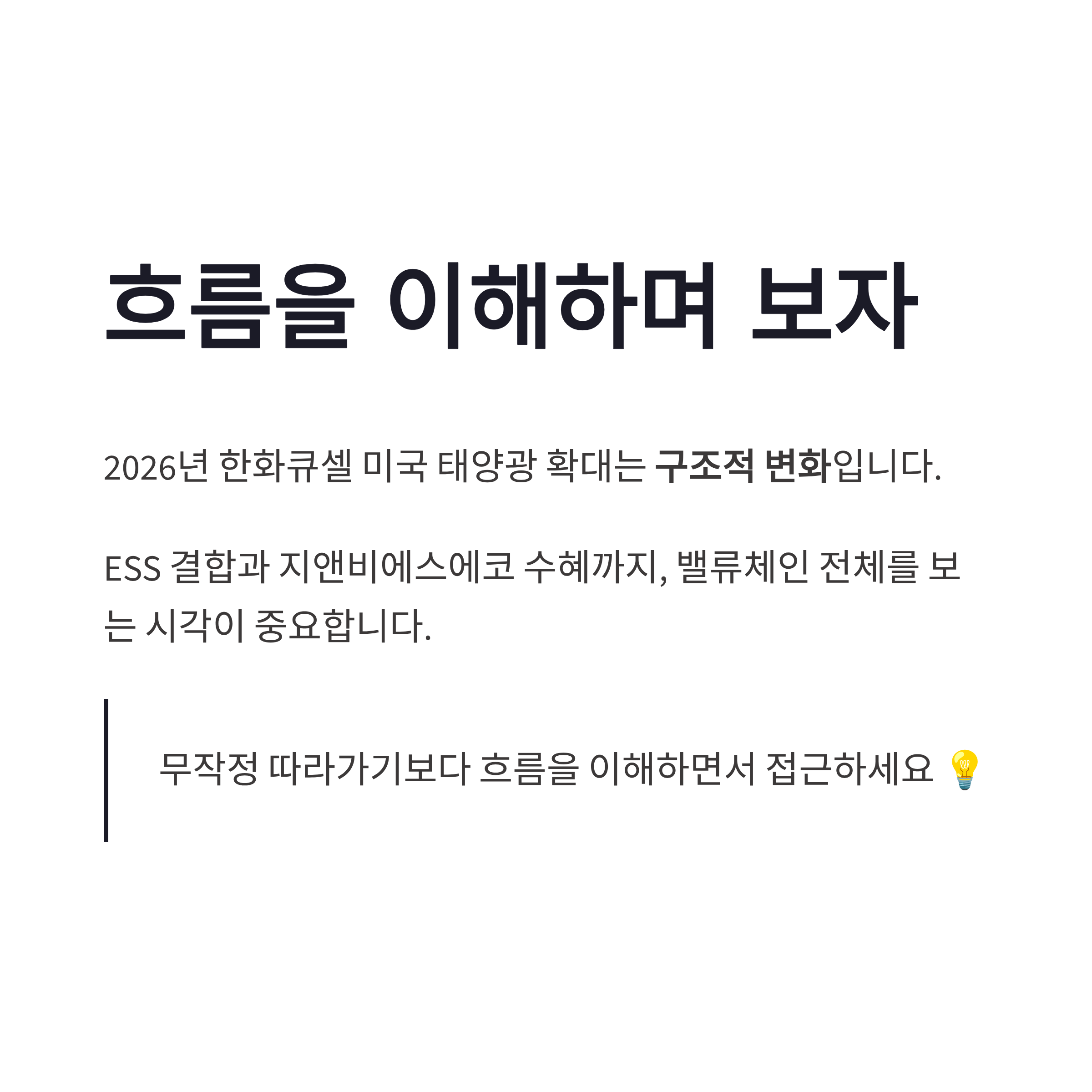 #한화큐셀 #한화큐셀미국태양광확대 #한화솔루션 #태양광주 #미국태양광 #ESS사업 #지앤비에스에코 #태양광수혜주 #신재생에너지 #에너지저장장치 #미국IRA #태양광전망 #주식흐름 #2026투자 #태양광밸류체인