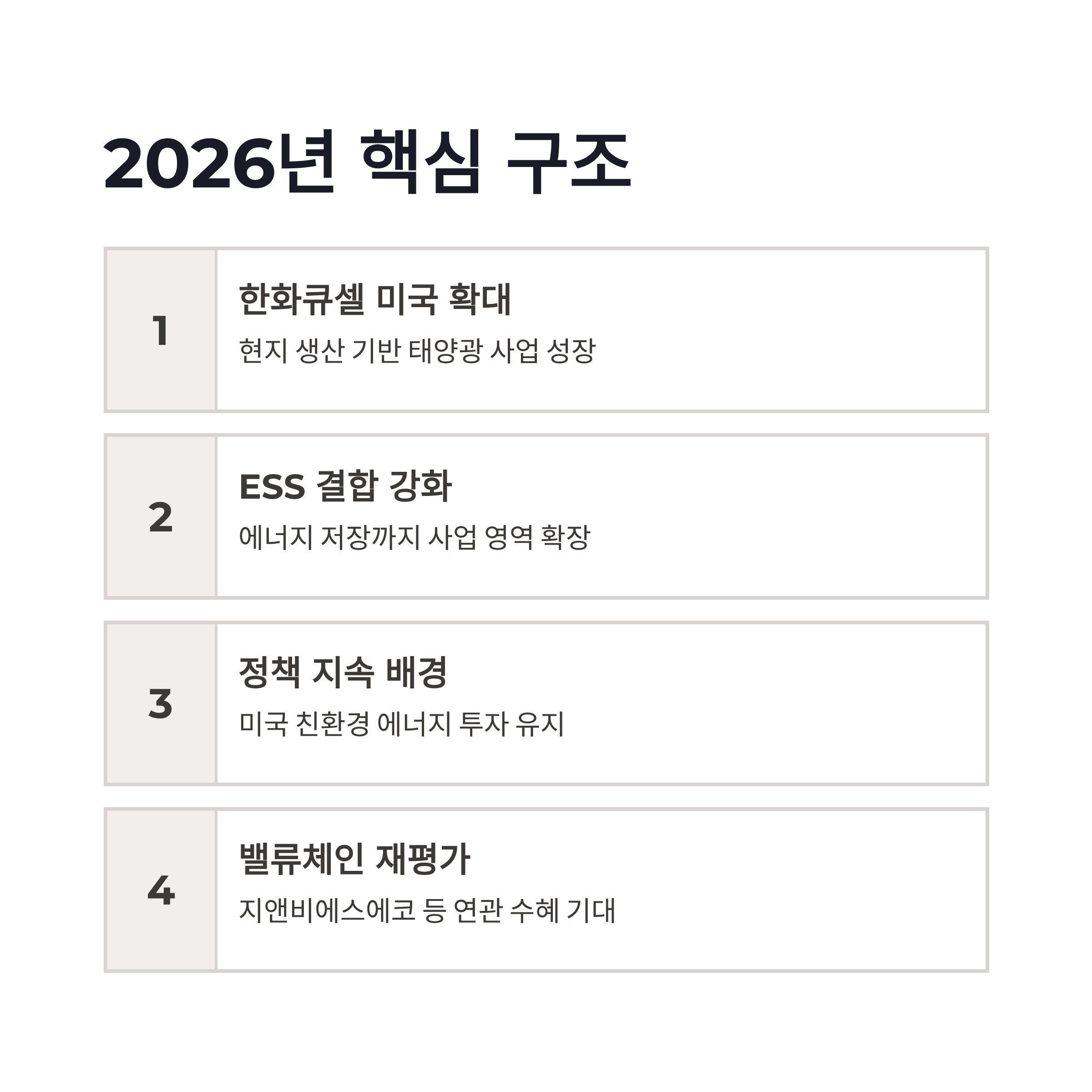 | 핵심 축 | 한화큐셀 미국 태양광 확대 + ESS |