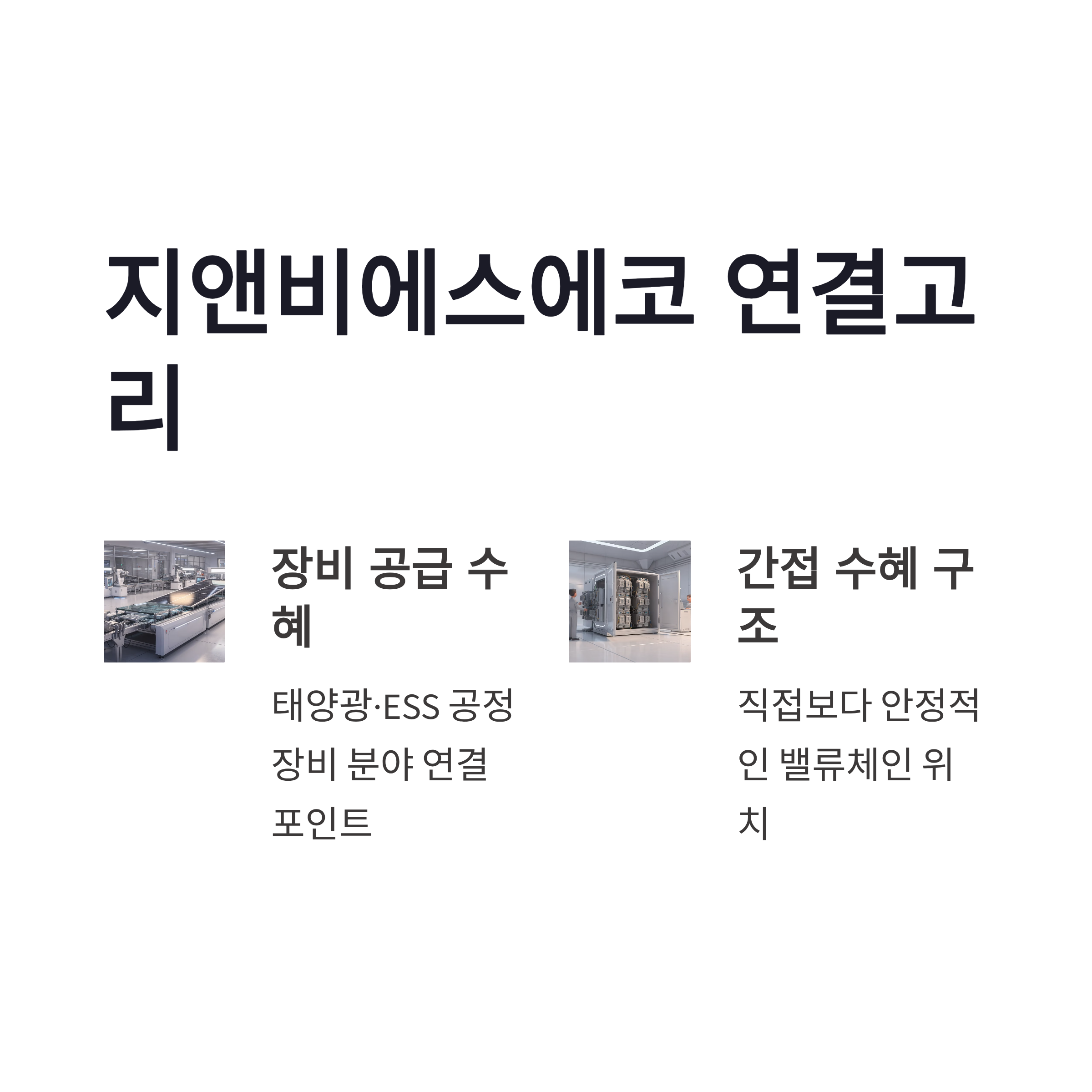 요즘 태양광은 발전만 보면 반쪽짜리잖아요. ESS(에너지저장장치)까지 같이 가야 그림이 완성되는데, 한화큐셀도 이 흐름을 제대로 타는 느낌이었습니다. 발전 → 저장 → 활용까지 이어지니까 사업 밸류 자체가 달라지더라구요. 이 과정에서 자연스럽게 언급되는 종목이 지앤비에스에코였어요. 태양광·ESS 공정 장비 쪽에서 연결 포인트가 보이거든요. 직접 수혜는 아니지만, 이런 간접 수혜 구조가 오히려 안정적이라는 생각도 들었구요.