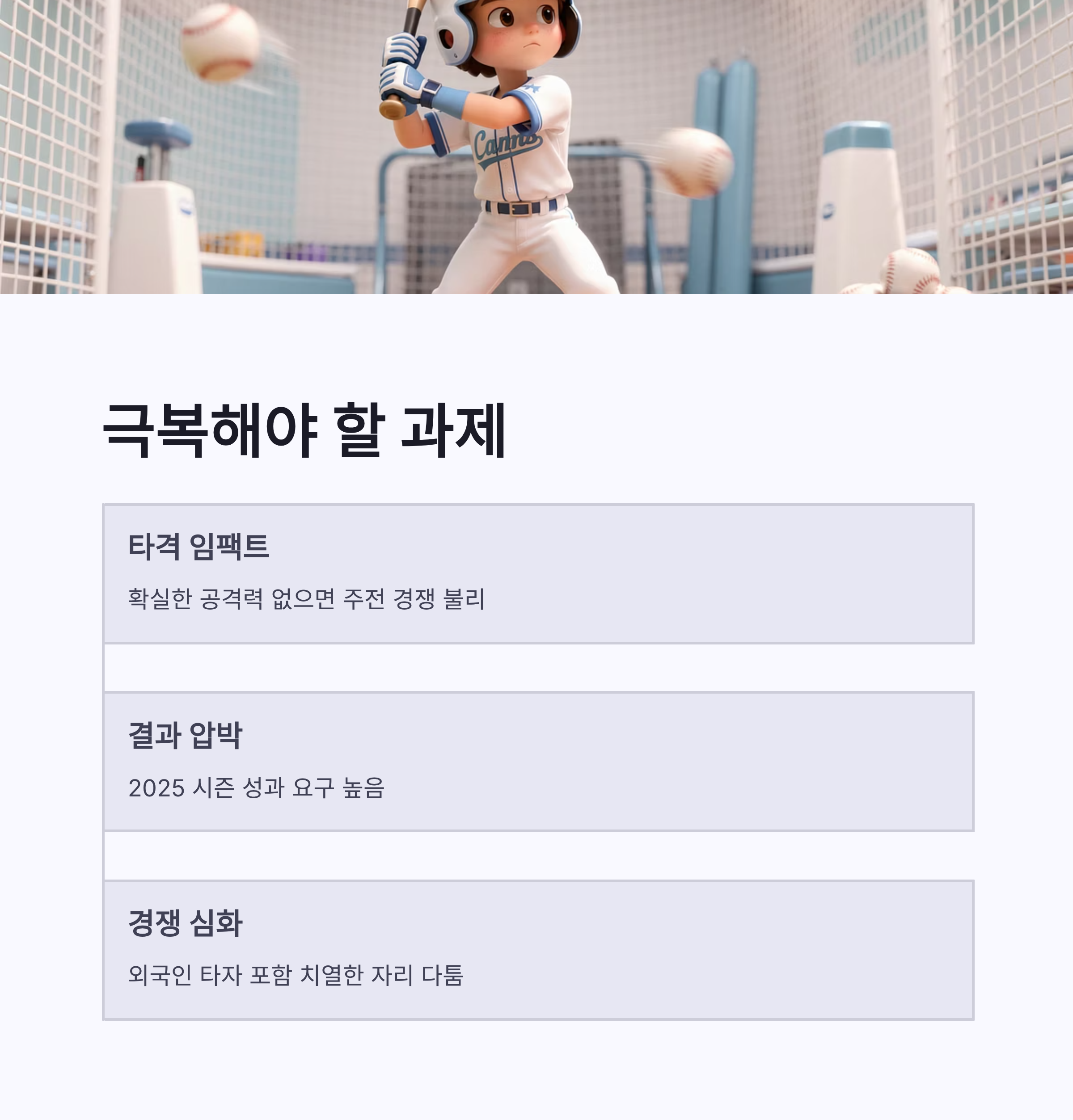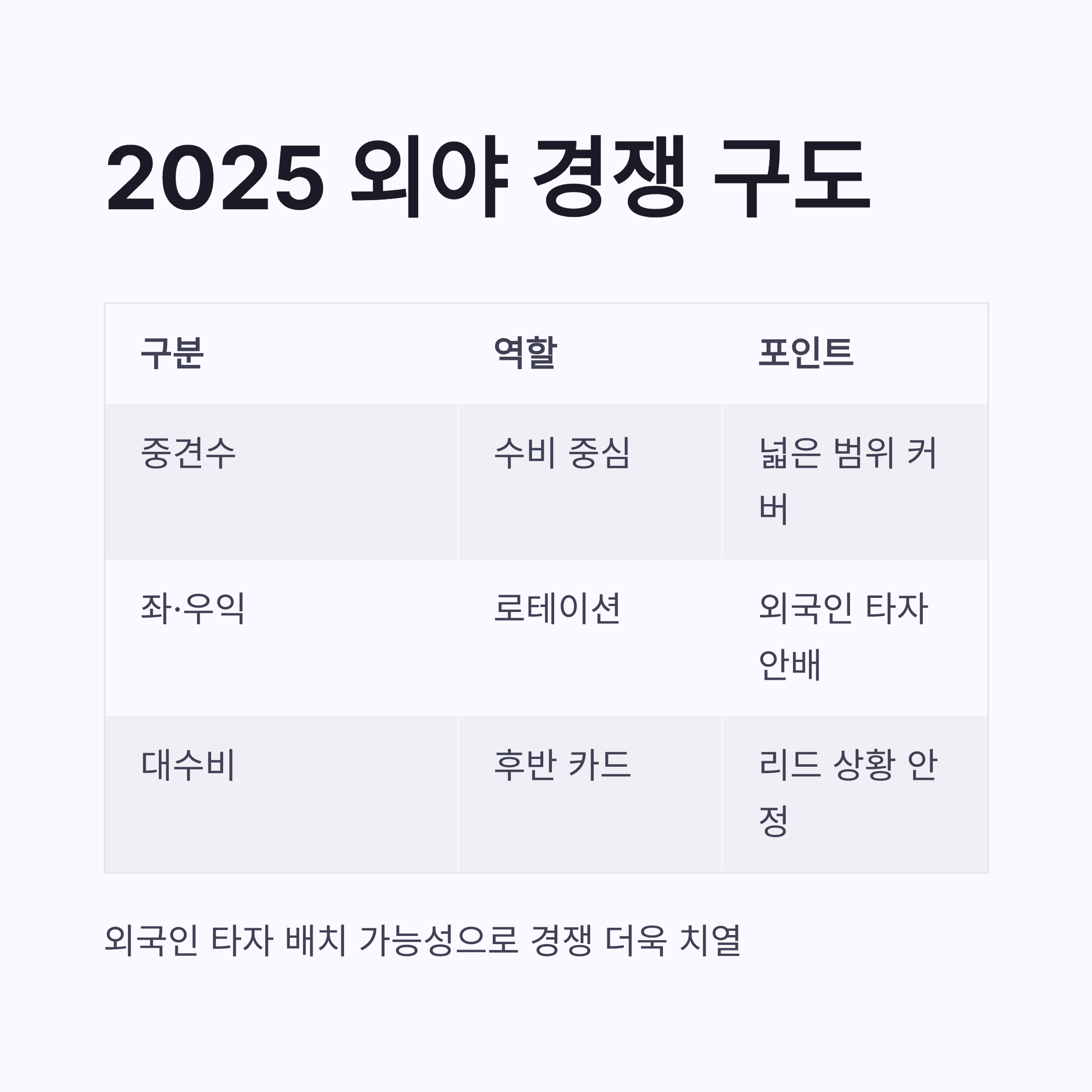2025 시즌 한화 외야진 재편을 보면 경쟁이 장난 아닙니다. 기존 외야 자원에 외국인 타자까지 들어올 가능성이 크다 보니, 오재원 활용법도 더 전략적으로 갈 수밖에 없어요. 주전 고정이 아니라 플래툰+백업+대수비 조합도 충분히 현실적인 그림입니다.